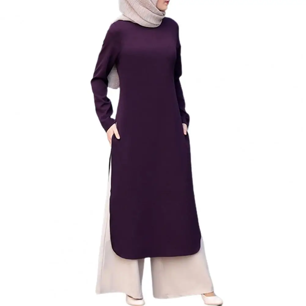 Мусульманское платье-абайя, Длинные Топы, Арабская индейка, Дубай, короткие однотонные с Боковым Разрезом, о-образным вырезом, Топ с длинным рукавом, одежда для исламистов