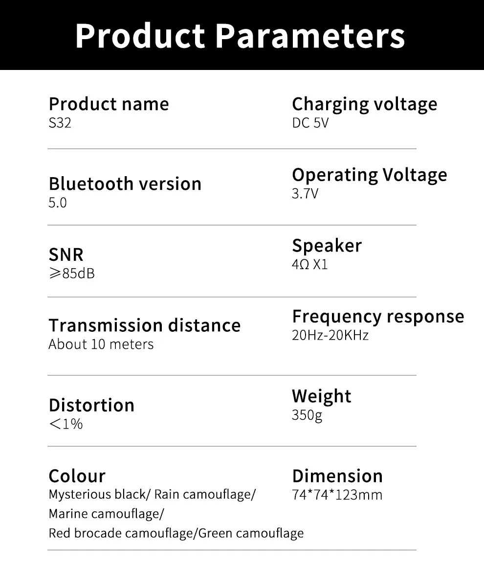 Особенности продукта:1. Bluetooth: 5,02. Аккумулятор: 2000 мАч3. Громкоговоритель: 4 Ω, 5W4. Дальность передачи: 10 м5. Продукт Размеры: 7,4 см x 7,4 см x 12,3 см6. Вес продукта: 350 г7. Время воспроизведения музыки: 4-6 часов8. Время работы в режиме разговора: 6 часов9. Время зарядки: 3 часа10. Время работы в режиме ожидания: 30 дней11. Совместимость с Iphone, телефонами Android, IPad(S32 не имеет FM)