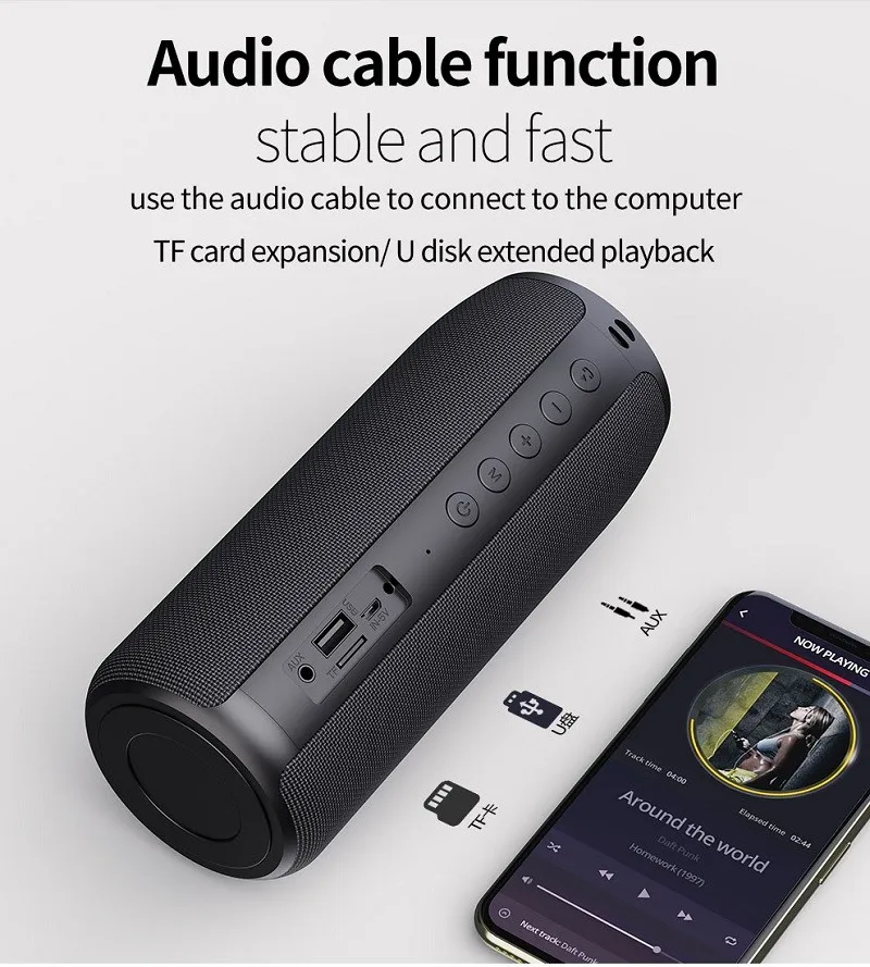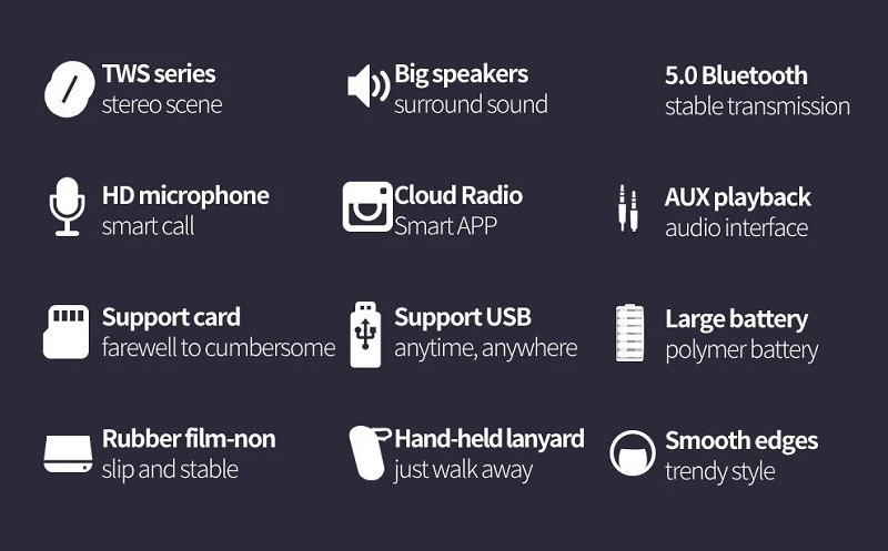 Особенности продукта:1. Bluetooth: 5,02. Аккумулятор: 1800 мАч3. Громкоговоритель: 4 Ω, 2*5W4. Дальность передачи: 10 м5. Размер изделия: 8 см x 8 см x 19,2 см6. Вес продукта: 500 г7. Время воспроизведения музыки: 4-6 часов8. Время работы в режиме разговора: 6 часов9. Время зарядки: 3 часа10. Время работы в режиме ожидания: 30 дней11. Совместимость с Iphone, телефонами Android, IPad12. Переключение режима: Нажмите кнопку M, чтобы переключить режим BT, TF, USB, AUX, FM13. Режим FM: в режиме FM нажмите кнопку паузы для автоматического поиска каналов, нажмите кнопку (-) для переключения на предыдущую станцию и удерживайте (+) кнопка для переключения на следующую станцию