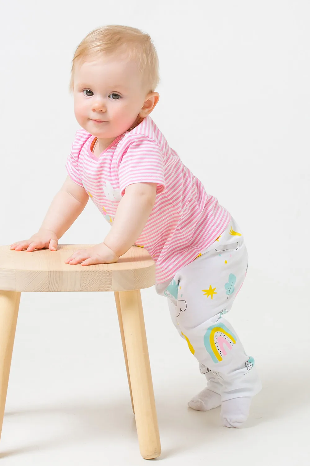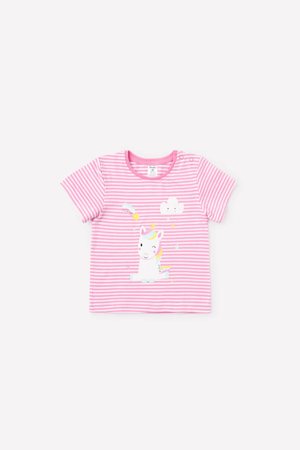 Описание: Розовая футболка в полоску для девочки. Украшена забавным принтом. Застёгивается на кнопки в области плеча.