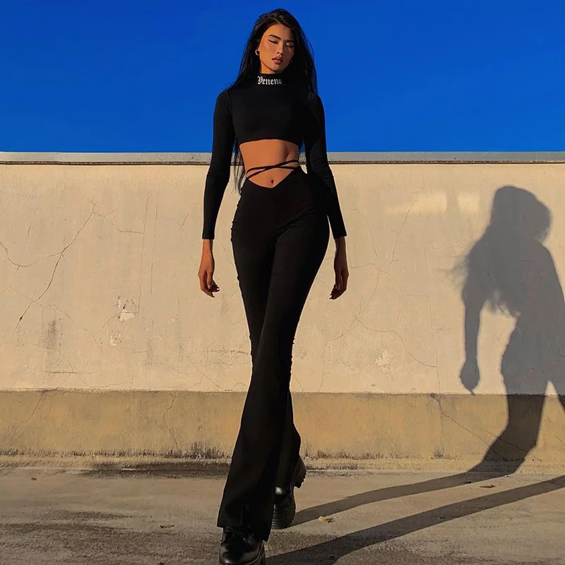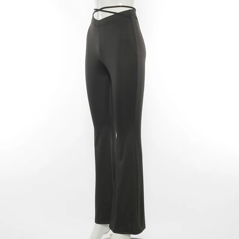 Женские пикантные расклешенные брюки с высокой талией, черное облегающее платье на шнуровке с V-образным вырезом, элегантные эластичные узкие широкие брюки, 2021