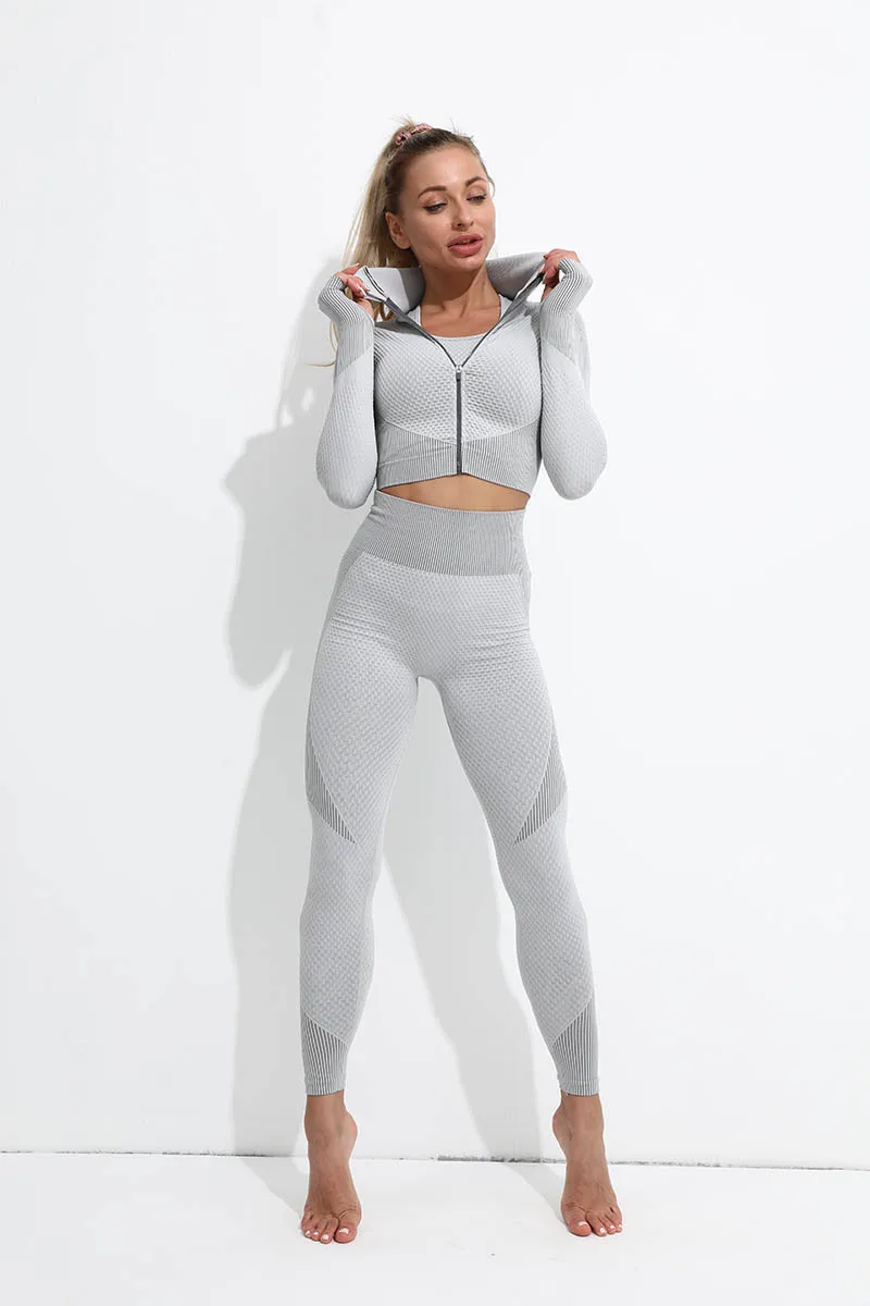 Женский комплект для йоги, облегающий комплект для йоги, дышащий Топ с длинным рукавом, бесшовная одежда, леггинсы с высокой талией и пуш-ап, спортивный костюм на молнии для женщин