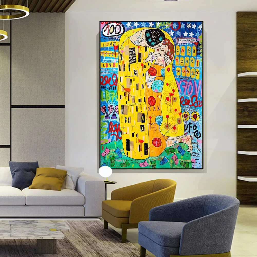 Плакаты и принты, граффити, Картина на холсте, поцелуй Климта, поп-стрит, настенные картины, современная картина для домашнего декора