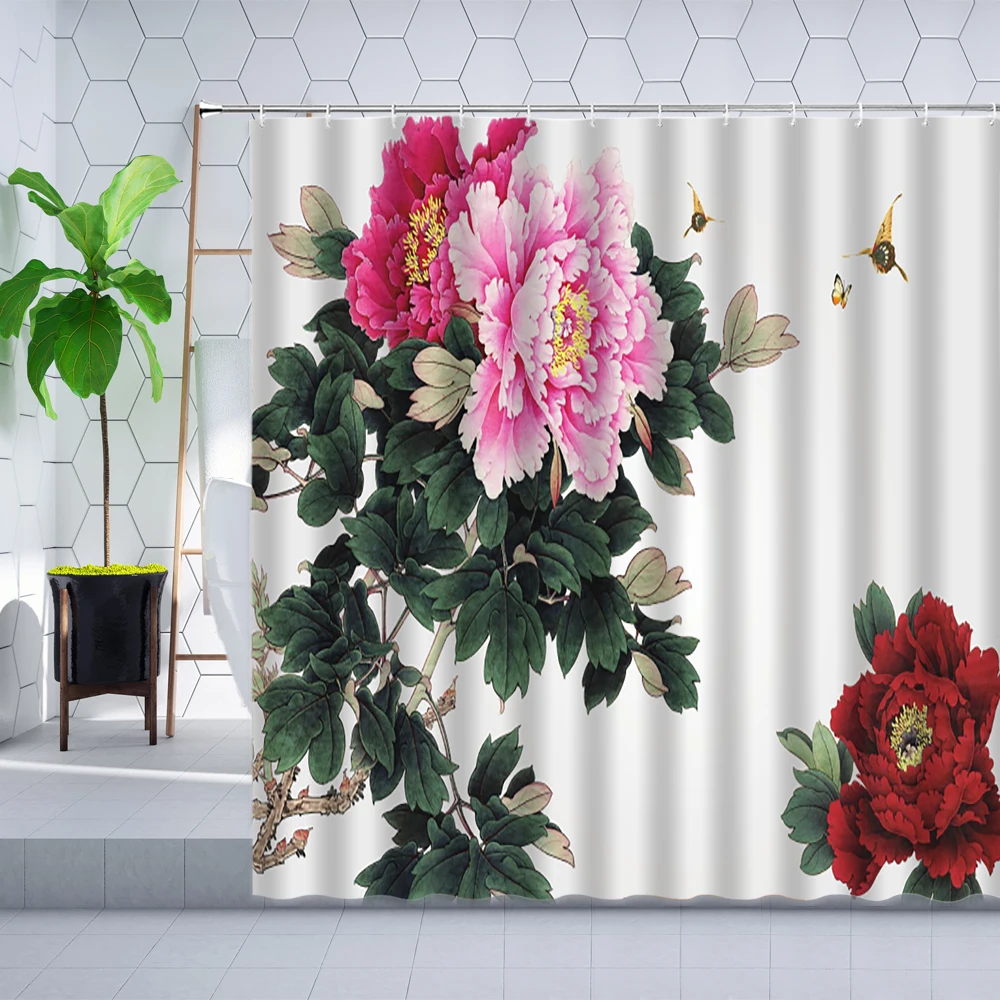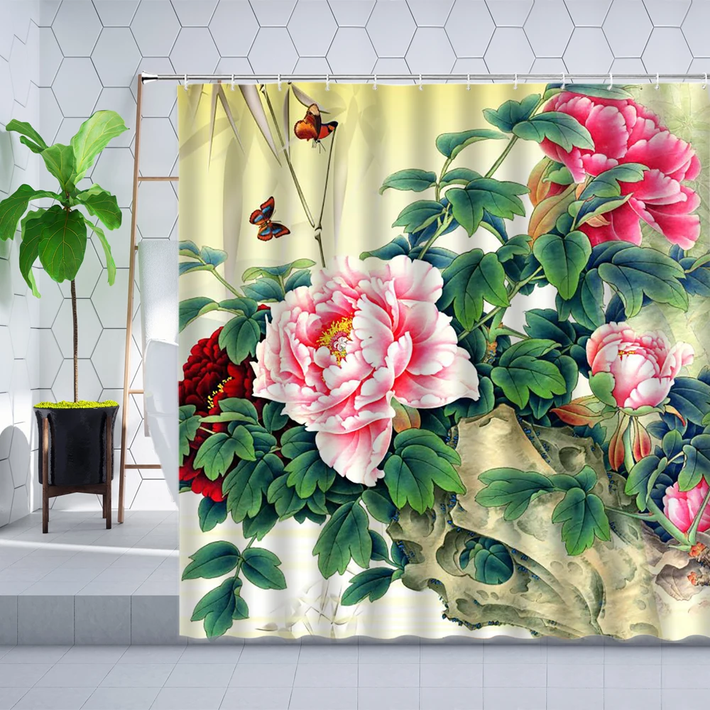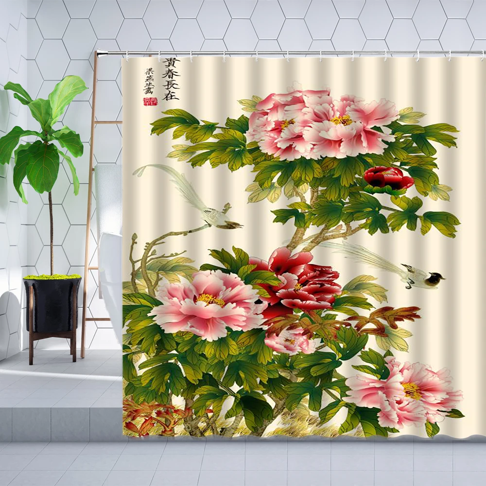 Занавеска для душа в китайском стиле с цветами, пионами, лотосом, б...