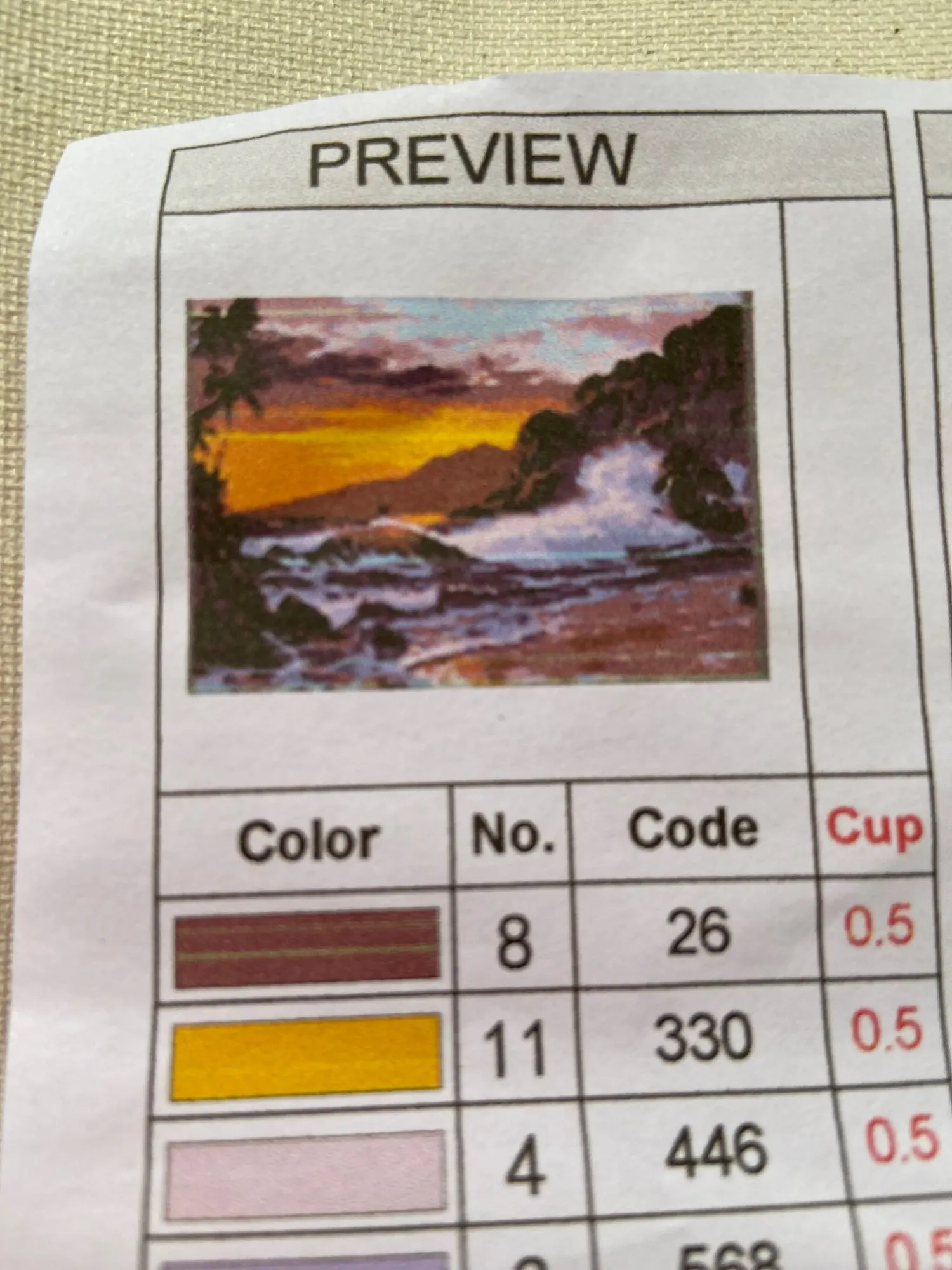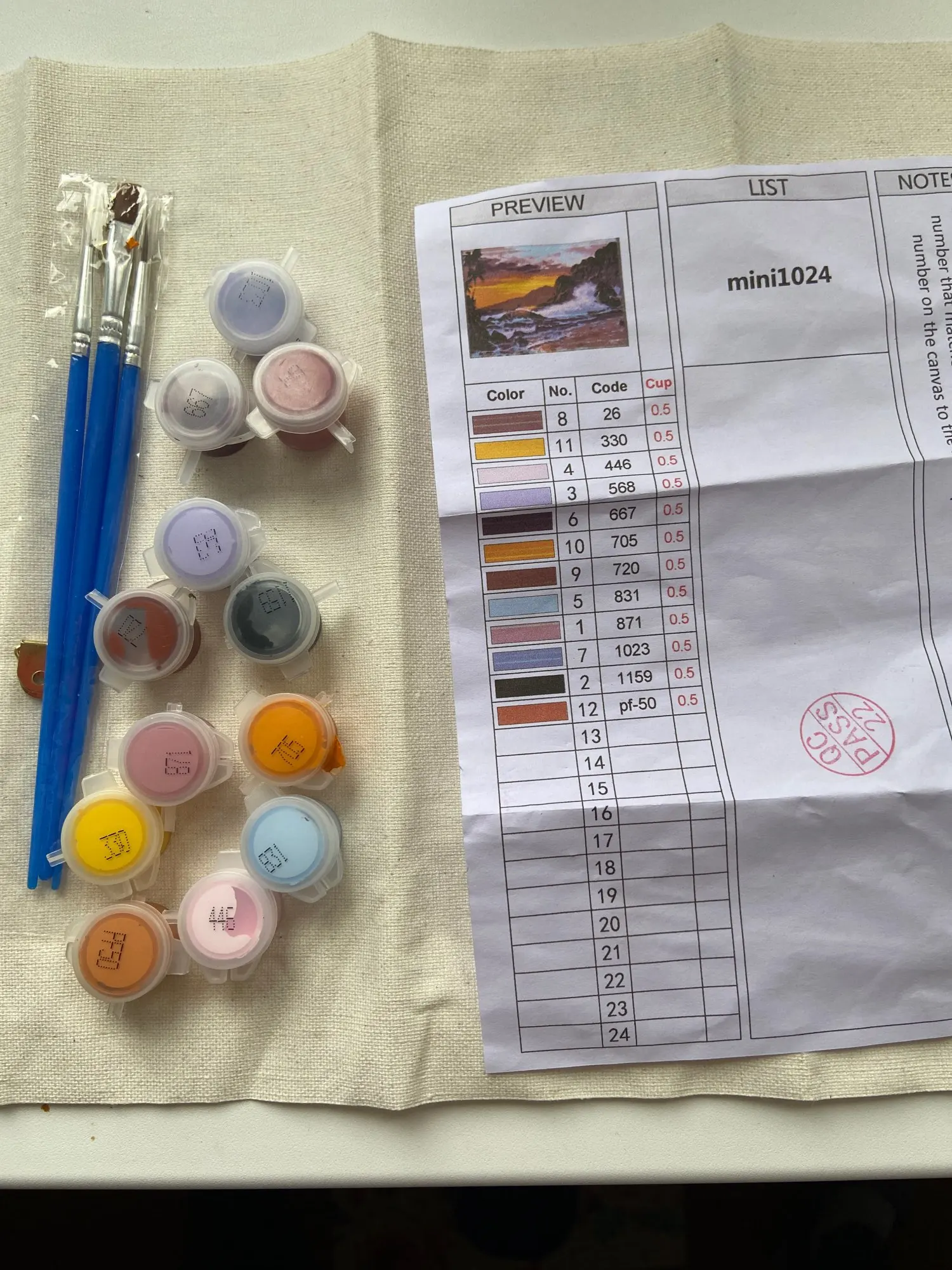 Что внутри: льняное полотно; 3 кисти; 1 Набор акриловой краски; Файл инструкции; Справочный лист; Рамка; Вешалка; Винты.