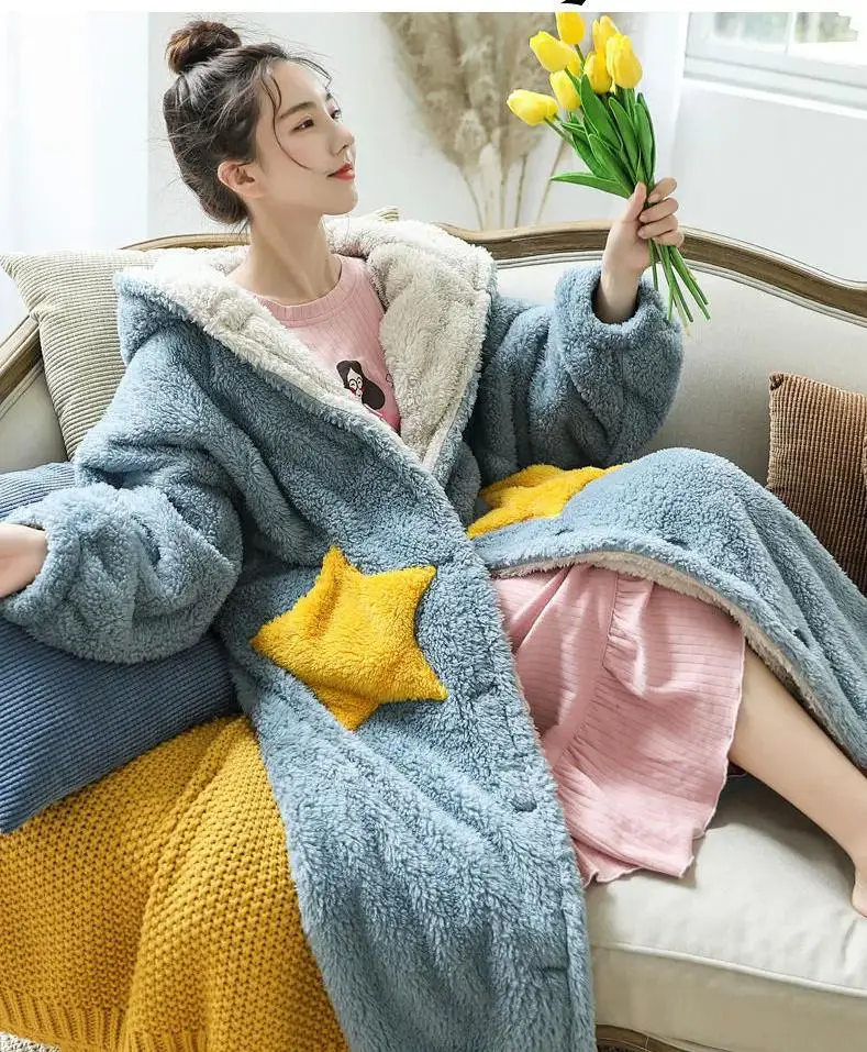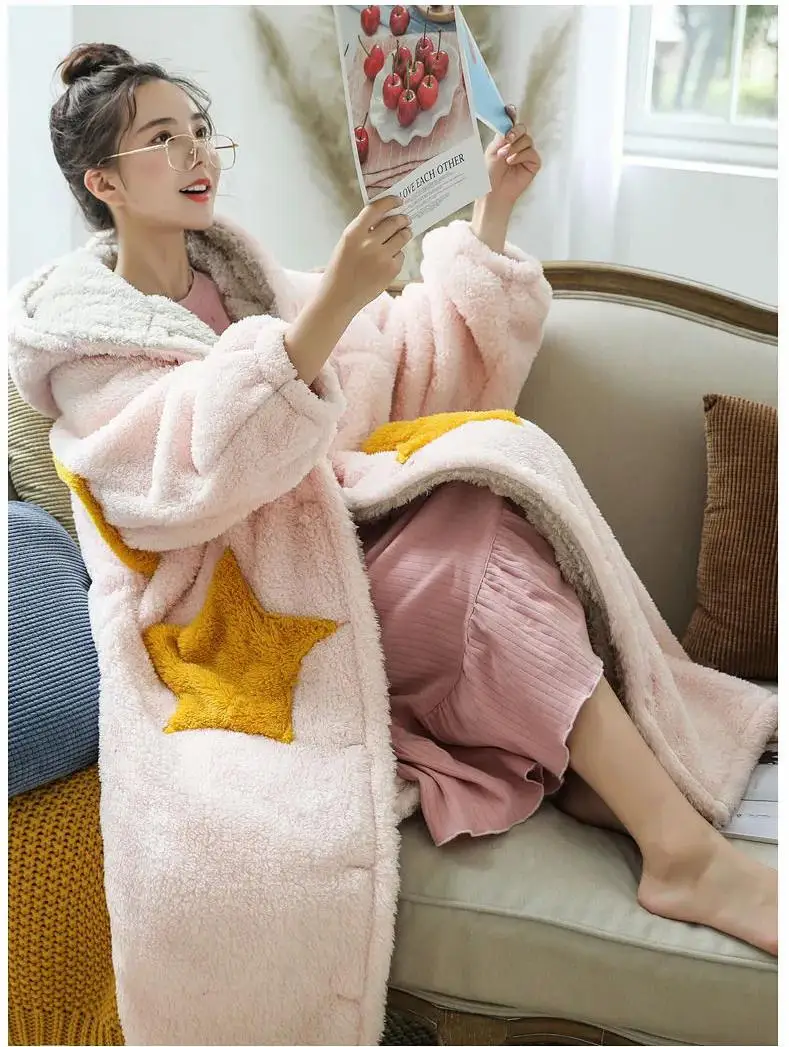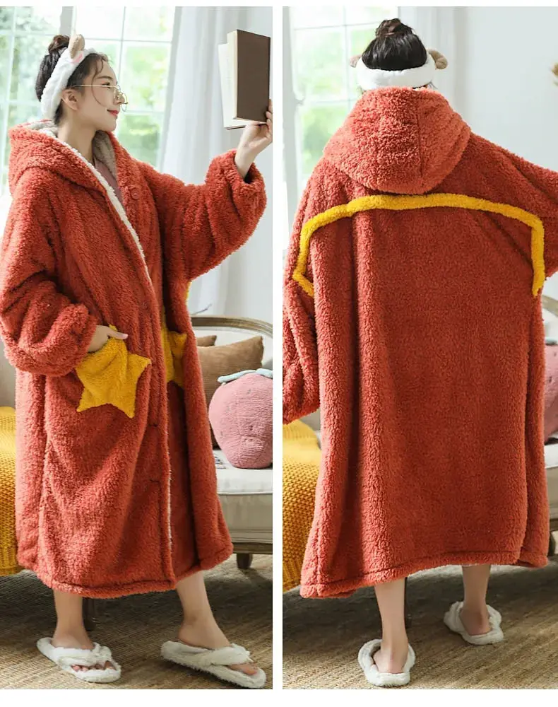 Милый флисовый халат кораллового цвета, женская ночная рубашка с толстым капюшоном, Ночная одежда, зимняя теплая фланелевая ночная рубашка с карманами, домашняя одежда