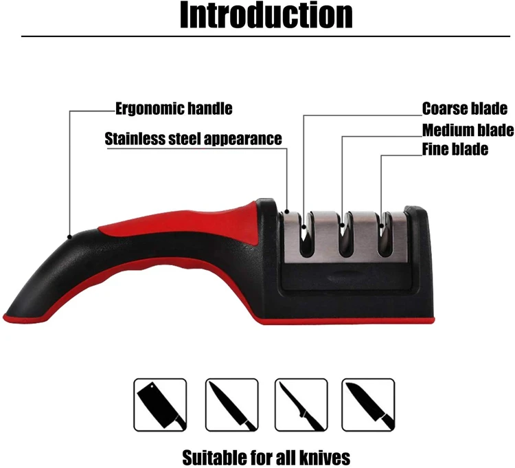 Особенности:* Стильный и безопасный дизайн, легко чистить и хранить.* Нескользящие резиновые ножки обеспечивают вашу устойчивость при заточке* 3 стадии заточки (тонкая, керамическая и грубая), обеспечивают идеальный результат заточкиМатериал: АБС + слот из нержавеющей стали3-я ступенями слот Материал: Керамика + Вольфрам сталь + Керамика Как использовать-- 1-й шаг: "керамический" этап (подготовка): для ремонта поврежденных лезвий и выпрямления лезвий перед Заточка.-- 2-й шаг: «грубая» сцена (затачивание): Затачивает лезвие и восстанавливает режущую кромку в форме «V».-3-й шаг: «тонкая» сцена (тонкая Мелодия): полирует лезвие и выравнивает любые неровности поверхности, которые могут быть вызваны. Особенности:1. Стильный и безопасный дизайн, легко чистить и хранить.2. Нескользящие резиновые ножки обеспечивают вашу устойчивость при заточке3,3 стадии заточки (тонкая, керамическая и грубая), обеспечивают идеальный результат заточки Инструкции:1. Нож немного тупый, можно использовать керамическое отверстие, оттягивать назад около 5 раз, не забудьте не тянуть назад и вперед.2. При резке мяса, если он не резкий, сначала используйте алмазное отверстие, чтобы оттянуть 5 раз, а затем используйте керамическое отверстие, чтобы оттянуть 5 раз3. Нож очень тупой, можно использовать отверстие из вольфрамовой стали, оттягивать 5 раз.