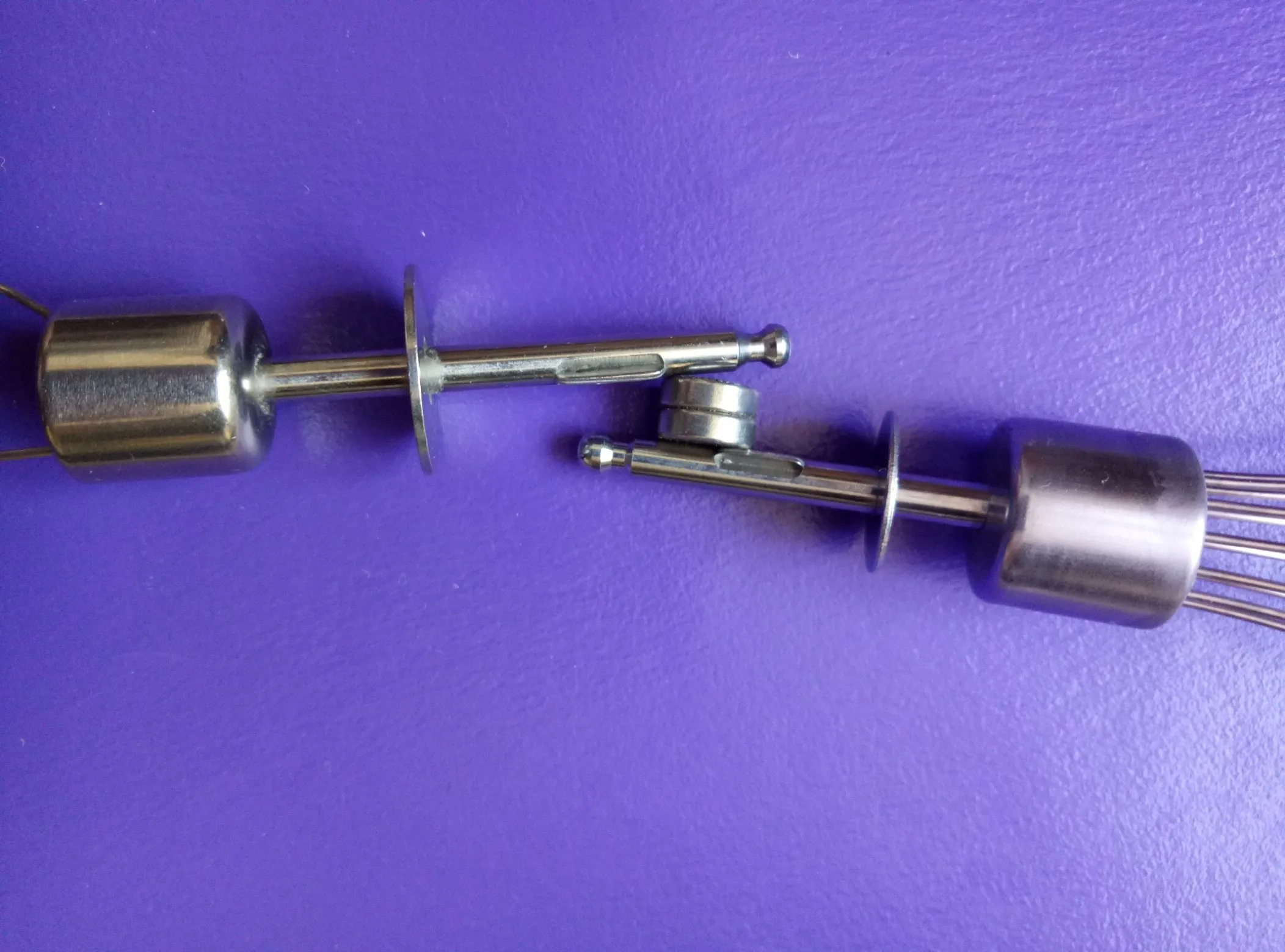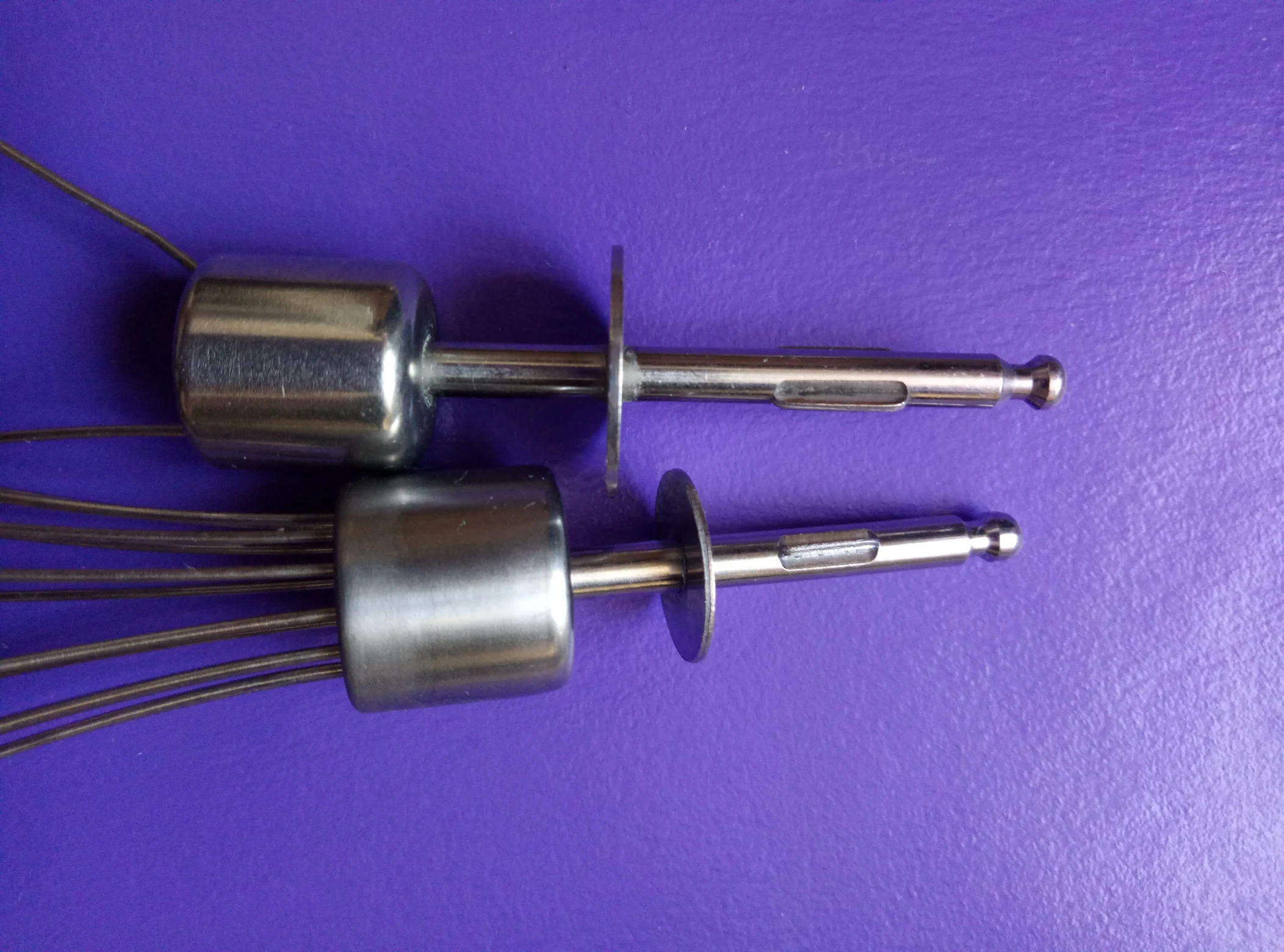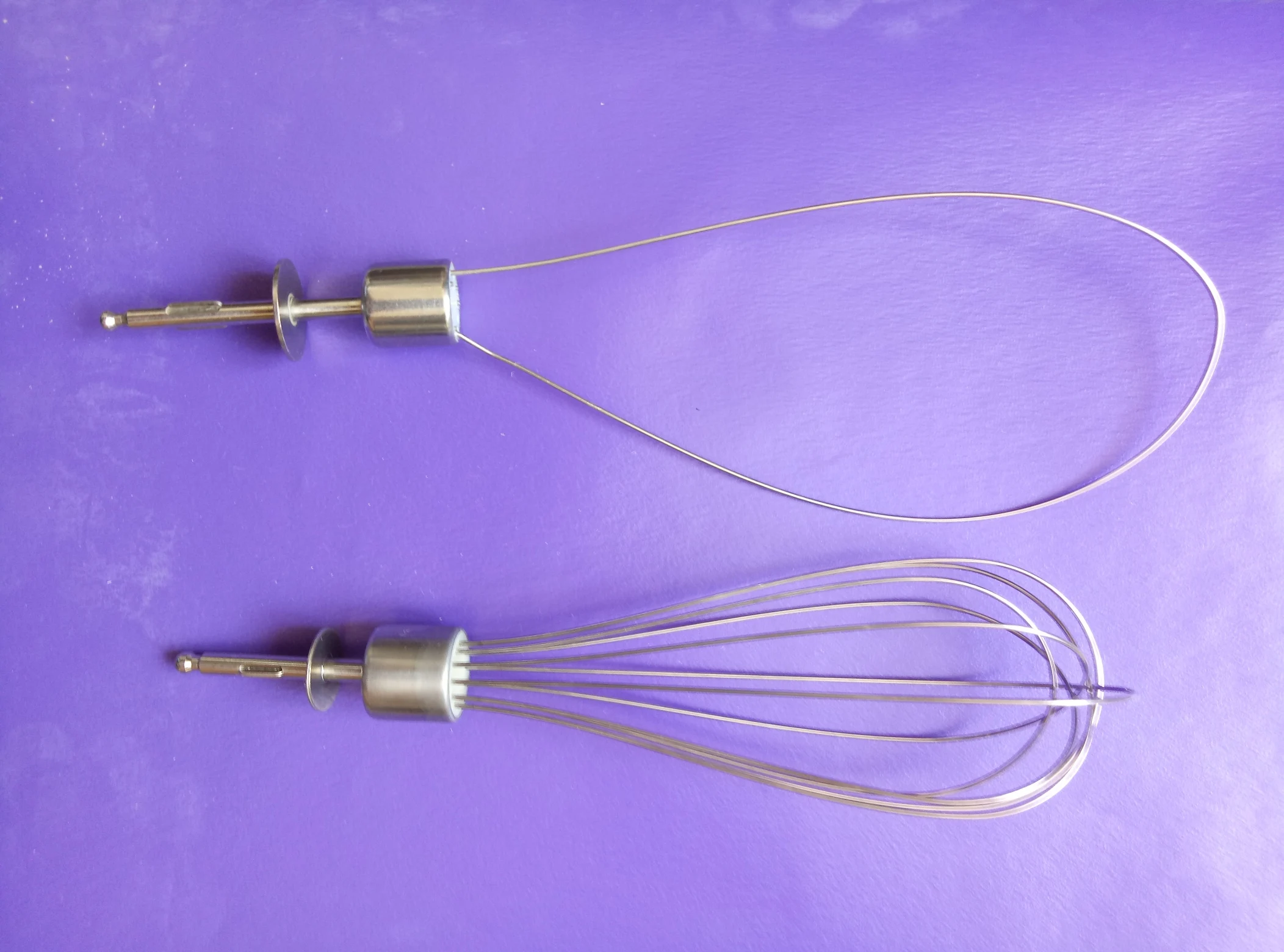 Меньше оригинального (на фото у него осталась одна проволока из шести). Штырь у нового сильно магнитится, в отличие от оригинального из нержавеющей стали. Также у оригинального более гладкий металл основания. Держится в блендере немного хуже оригинального, так как утолщение на краю штыря заметно больше у нового.