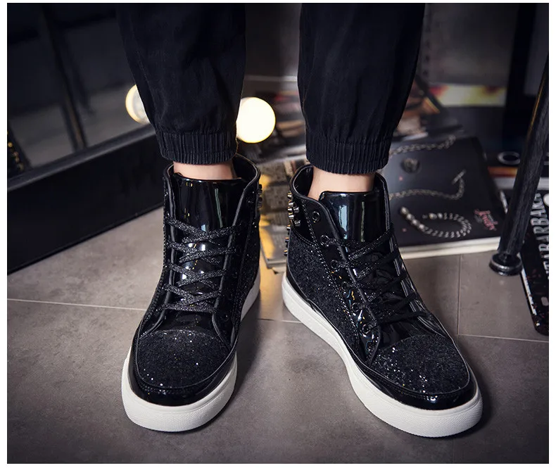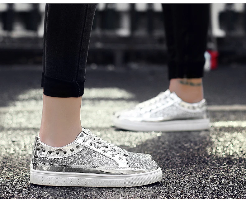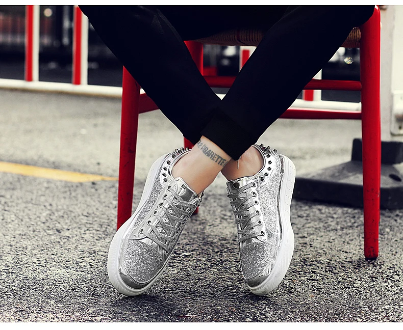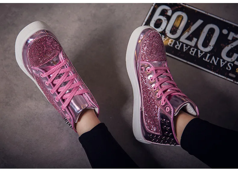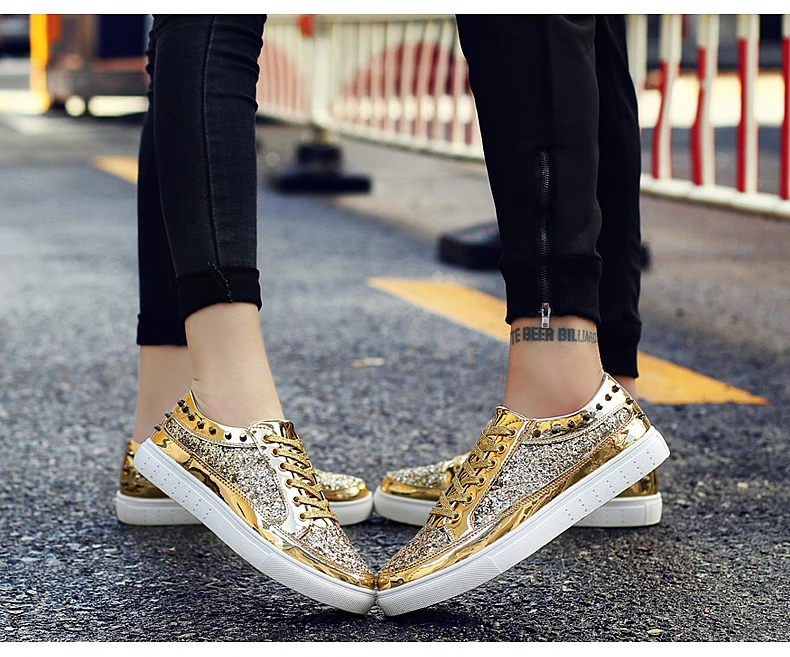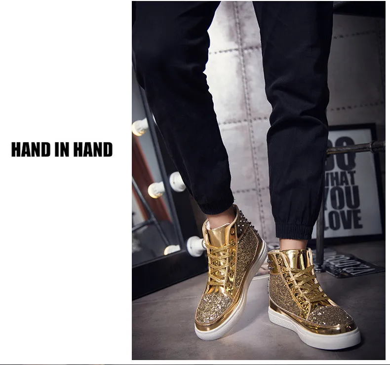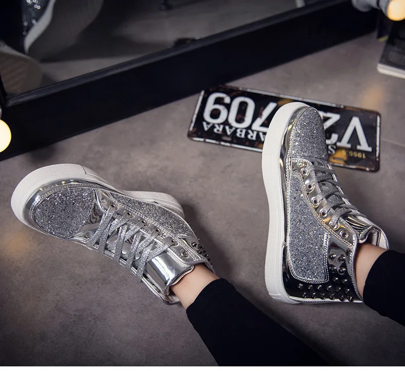 Мужские высокие кроссовки со шнуровкой, золотистые кроссовки с блестками и заклепками, повседневная обувь для пар, 2021