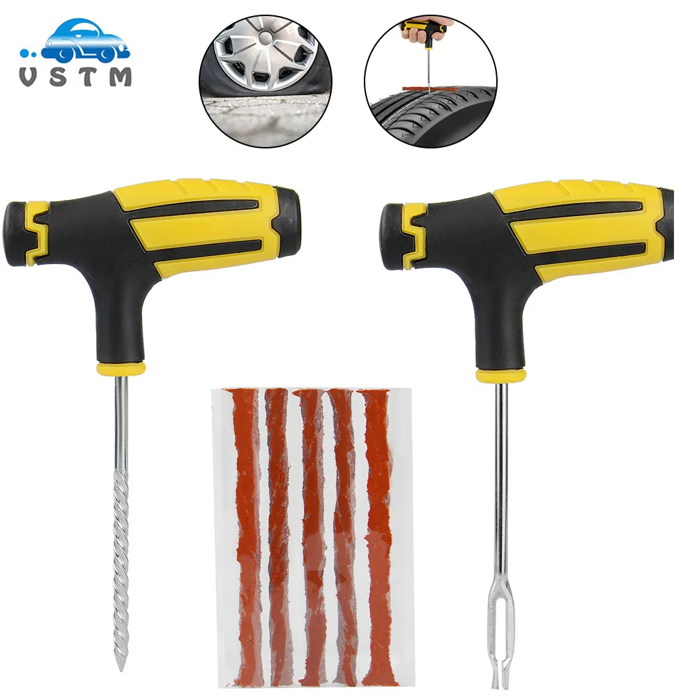 Особенности:Комплект для ремонта проколов бескамерных шин.Набор для ремонта автомобильных шин позволит вам быстро и эффективно исправить проколы.Прочные пластиковые ручки обеспечивают отличный захват.Инструкции прилагаются с обратной стороны упаковки.Незаменим для автомобилей с бескамерными шинами.Этот Рашпиль позволяет расширить и очистить отверстия шины.Игольчатый инструмент позволяет вставить резиновую полоску шины.Включает 5 ремонтных резиновых полосок.Полезный инструмент для хранения в автомобиле с запасными колесами.