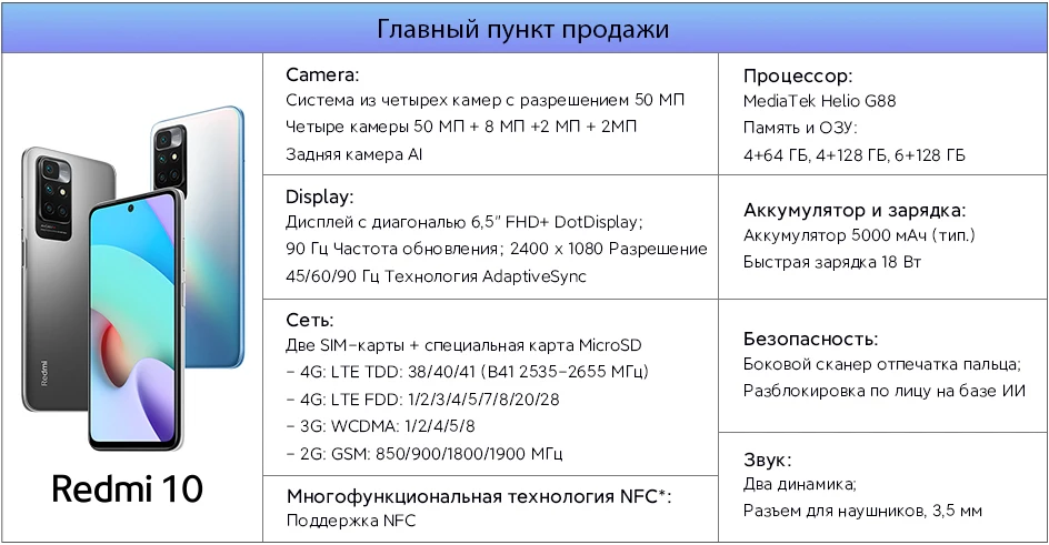 Глобальная версия смартфона Xiaomi Redmi 10 без NFC 50MP AI quad camera 90Hz FHD Display MediaTek Helio G88