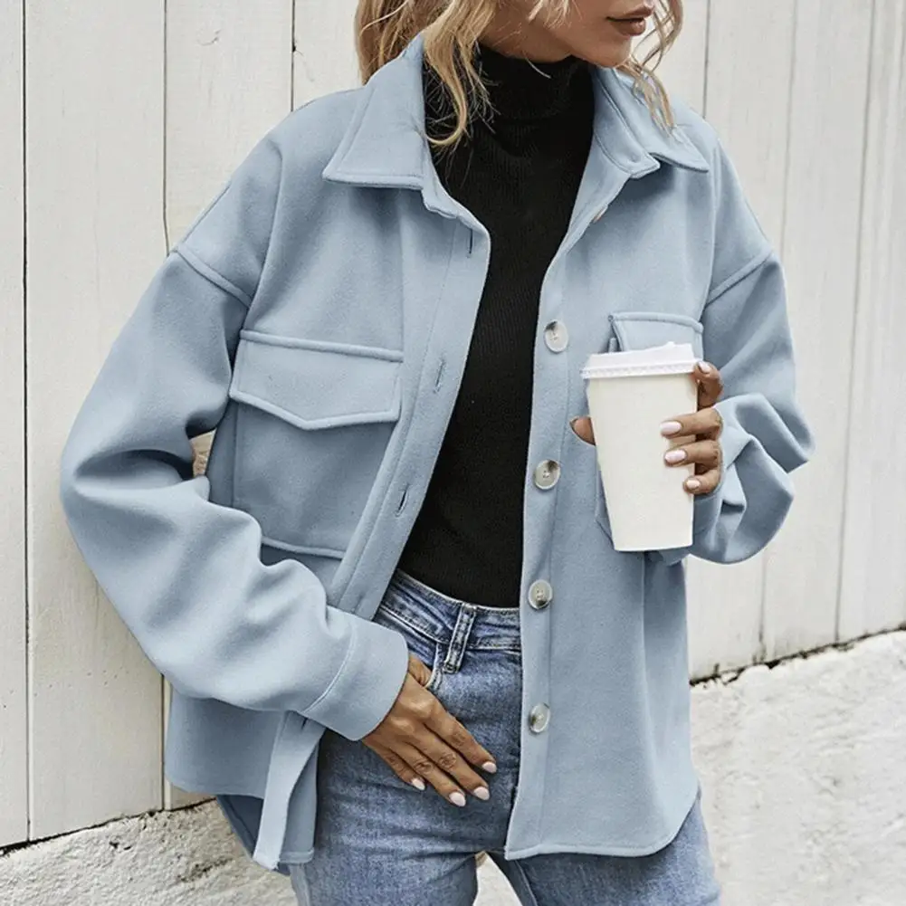 Женская однобортная куртка, Однотонное шерстяное пальто с отложным воротником и карманами, однотонная однобортная куртка на осень и зиму