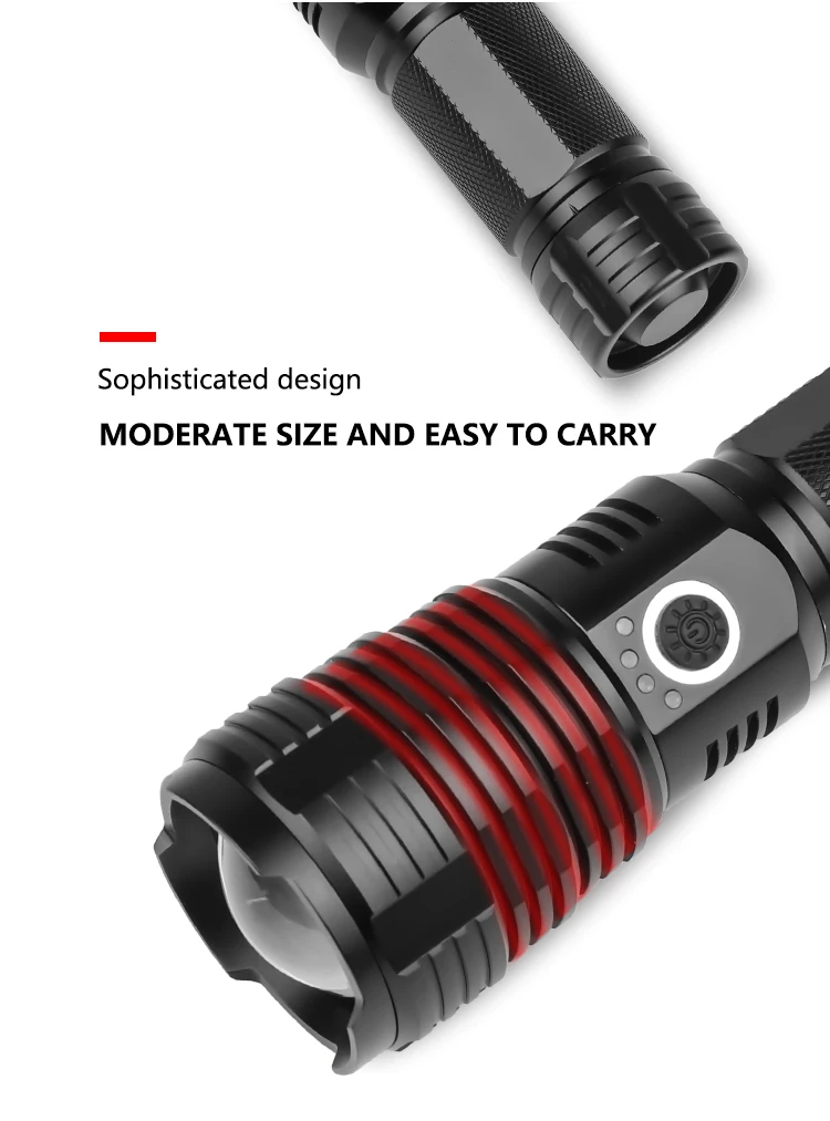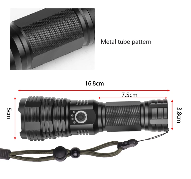 Модель: 1915B Размер изделия: 16,8*5*3,8 см Вес нетто: 275 г Материал: алюминиевый сплав Переключатель: нажмите переключатель Аккумулятор: 1*26650/1*18650 (не входит в комплект) Способ зарядки: micro USB зарядка Метод масштабирования: телескопический зум Положение шестерни: 5 передач s: 100%-70%-50%-вспышка-SOS Особенности: Мощность дисплей, 3V P70 лампы, тяжелый наружный светильник, спокойствию, а также полный захват