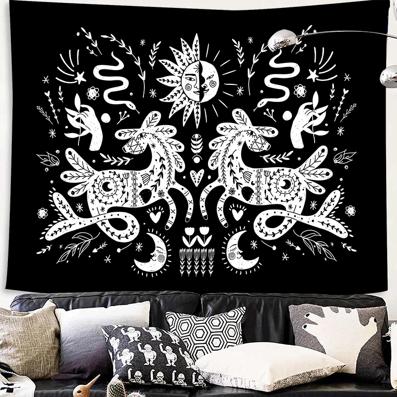 Гобелен черно-белый с Луной, солнцем, мандалой, богемный декор, нас...
