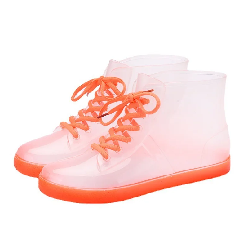 Прозрачные женские резиновые сапоги, Женская водонепроницаемая обувь на шнуровке, прозрачные ботильоны карамельных цветов с подошвой, уличные непромокаемые сапоги для девочек