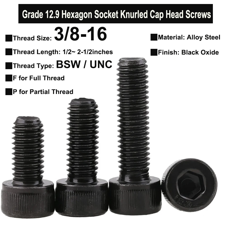 Винты класса 12,9, 5 шт., 3/8-16 BSW/UNC, резьба, легированная сталь, шестигранное гнездо, болты с рифленой головкой, длина резьбы 1/2 ~ 2-1/2 дюйма