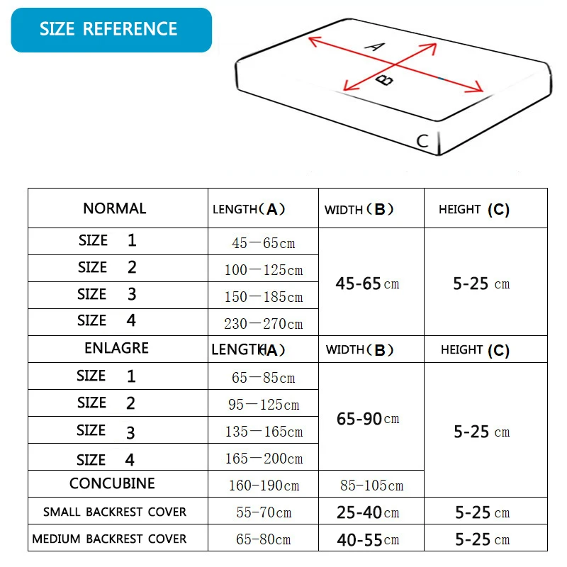ПараметрыМатериал: флис + спандексЦвет: разноцветный1 место: длина: 45-65 смШирина: 45-65 смТолщина: 5-25 см2 сиденья: длина: 100-125 смШирина: 45-65 смТолщина: 5-25 см3 сиденья: Длина: 150-190 смШирина: 45-65 смТолщина: 5-25 см4 сиденья: длина: 230-280 смШирина: 45-65 смТолщина: 5-25 смОчень большое 1 сиденье: длина: 65-95 смШирина: 65-95 смТолщина: 5-25 смОчень большое 2 сиденья: длина: 95-135 смШирина: 65-95 смТолщина: 5-25 смОчень большое 3 сиденья: Длина: 135-165 смШирина: 65-95 смТолщина: 5-25 смОчень большое 4 сиденья: длина: 165-200 смШирина: 65-95 смТолщина: 5-25 см