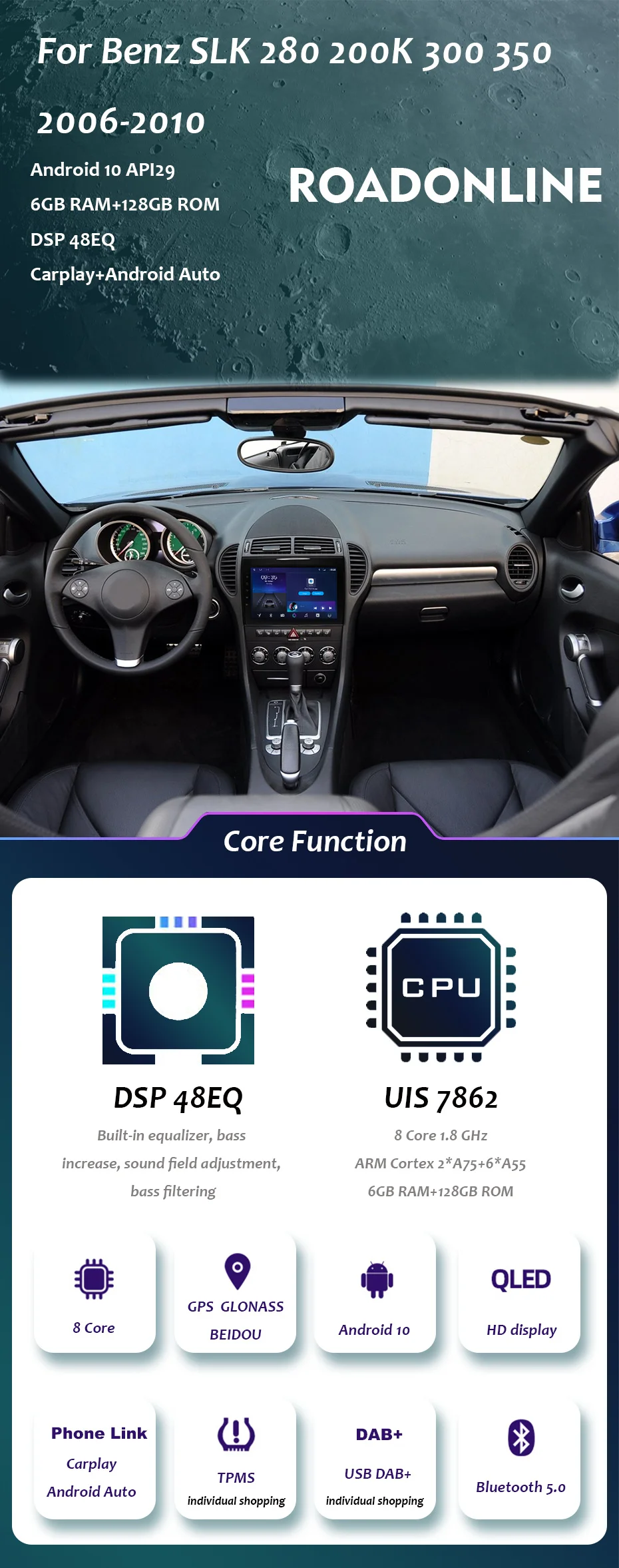 Автомагнитола Roadonline с GPS-навигацией, мультимедийный плеер для Benz SLK 280, 200K, 300, 350, 2006-2010, Android, аудио, стерео, 4G, Wi-Fi, BK