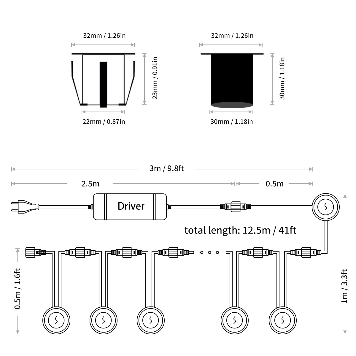 Подземные светильники сделаны из поликарбоната и нержавеющей стали с водонепроницаемостью IP67. Поэтому он чрезвычайно подходит для внутреннего и наружного декора, может быть установлен в любом месте, где вы можете просверлить отверстияОсобенности:DC12V Низкое напряжение на выходе, безопасность и удобство использования.Добавьте черные защитные оболочки для встроенных установленных на полу/каменных лестницах будет безопаснее для комплекта светодиодных ламп.IP67 водонепроницаемый, подходит для внутреннего и наружного декора, может быть установлен в любом месте, где вы можете просверлить отверстия.Яркое освещение палубы, что делает вас чувствовать себя сладким и комфортным в вашем доме.Широко используется в лестницах, полу и ванных комнатах, маркировке садовой дорожки, патио, двора и подъездных дорожек и т. д.Характеристики:Материал: Поликарбонат и нержавеющая стальЦвет: черныйАдаптер: US-AdapterВход: AC100-265V В переменного тока, 50/60 ГцВыход: DC12VКол-во: 10 шт.; 16 шт.(Опционально)Светильник Цвет: 2800-3200k теплый белый; 6000-6500k белый(Опционально)Светильник источник света: 1 * SMD2835 шарикУгол луча: 120 °Степень защиты: IP67Ведущий длина провода: 3-m/9.8ft (2,5 м + 0,5 м)Светильник на расстоянии: 1 м/3,3 футаХвост длина провода: 0,5 м/1.6ftОбщая длина: 12,5 М/41ft(10 шт.); 18,5 М/60.7ft(16 шт.)Размер изделия:Лампа: 32*23*22 мм/1,26*0,91 * 0.87inС корпусом: 32*30*30 мм/1,26*1,18*1,18 дюймовПосылка Вес: 720 г/1.59lb(10 шт.); 920g / 2.03lb(16 шт.)Посылка:10 шт.: 150*60*280 мм/5,91*2,36 * 11.02in16 шт.: 173*73*290 мм/6,81*2,87*11,42 дюймовУпаковочный лист:10/16 * палубные огни(Опционально)1 * адаптер1 * Руководство пользователя1 комплект * аксессуары