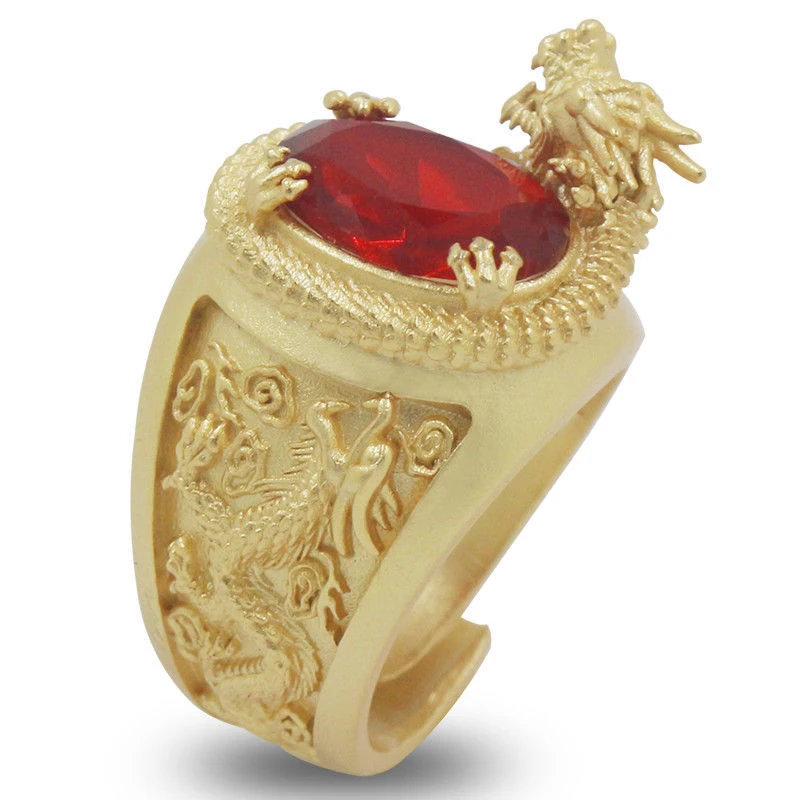 Кольца мужские с красным камнем, с инкрустацией, золотой дракон