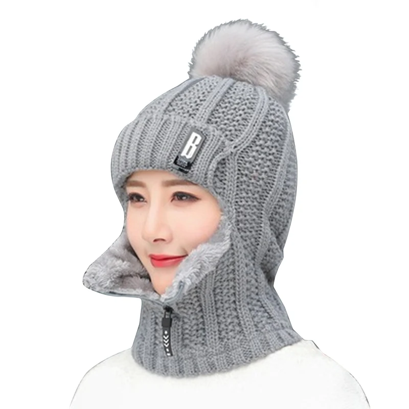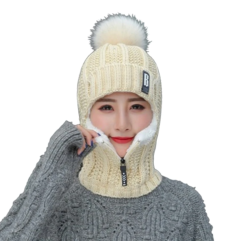 Женская шерстяная вязаная шапка, лыжные комплекты для женщин, ветрозащитная зимняя вязаная шапка для улицы, теплая плотная сиамская шапка с шарфом и воротником, теплая шапка