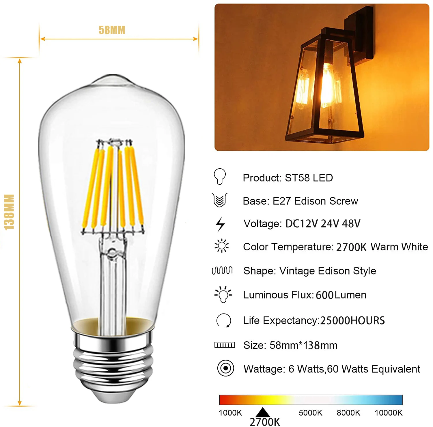 Светодиодсветодиодный Ретро лампа накаливания Эдисона Hcnew ST58, Постоянныйпеременный ток, 12 В, 24 В, 6 Вт, дневной белый свет, 4500k, низкое напряжение, теплый белый свет, 2700K, эквивалентная 60 Вт лампа