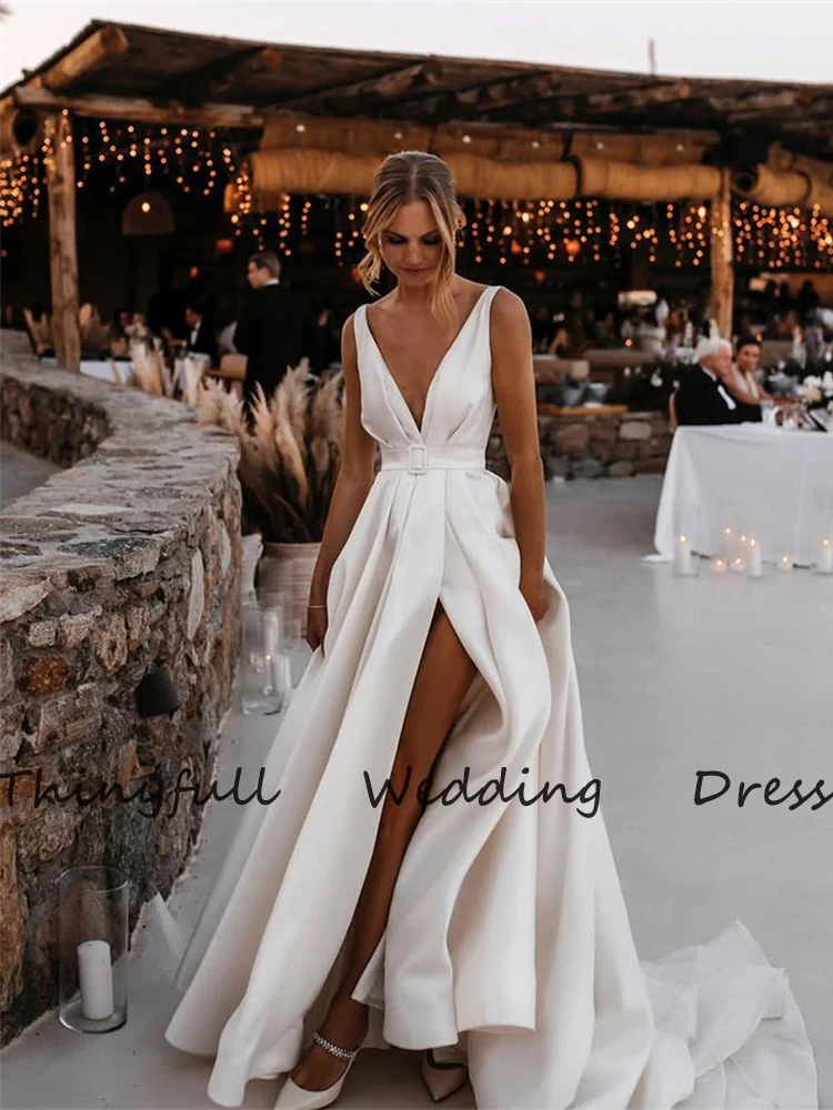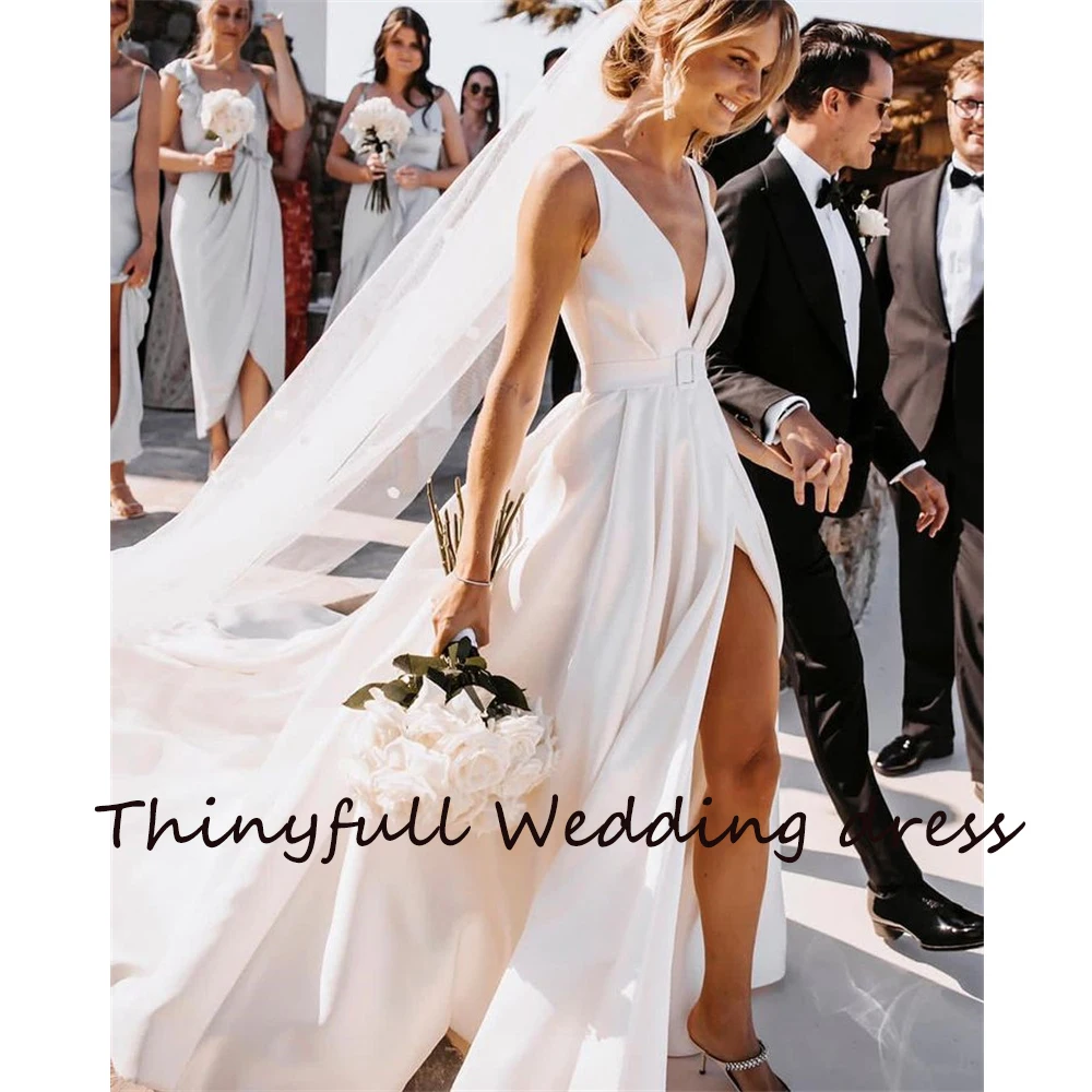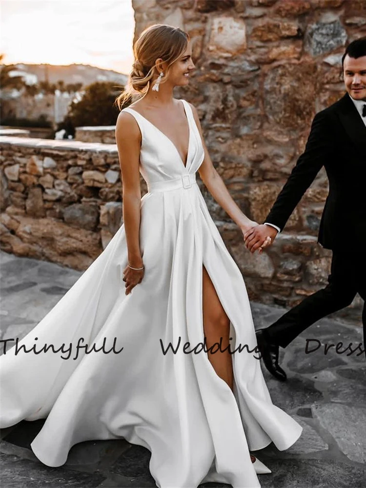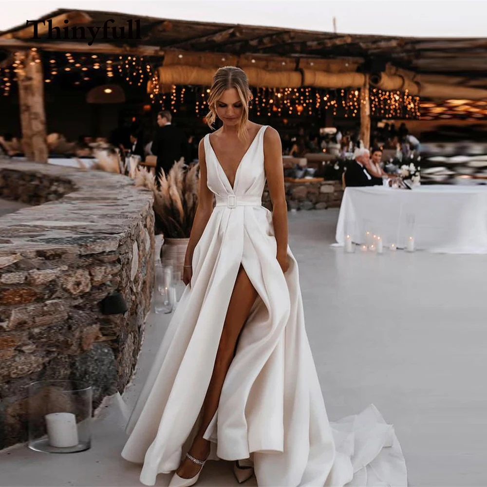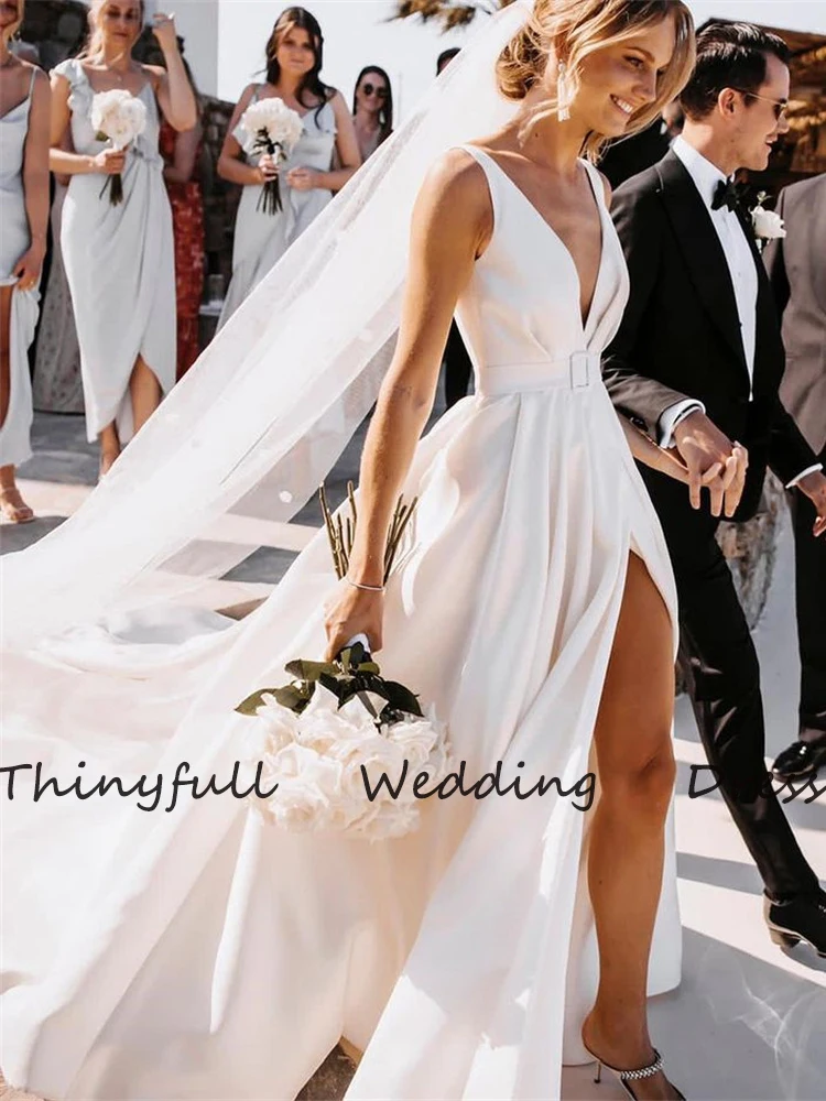 Длинное мягкое атласное длинное свадебное платье, с V-образным вырезом, с Боковым Разрезом, с длинным рукавом, с поясом, в пол