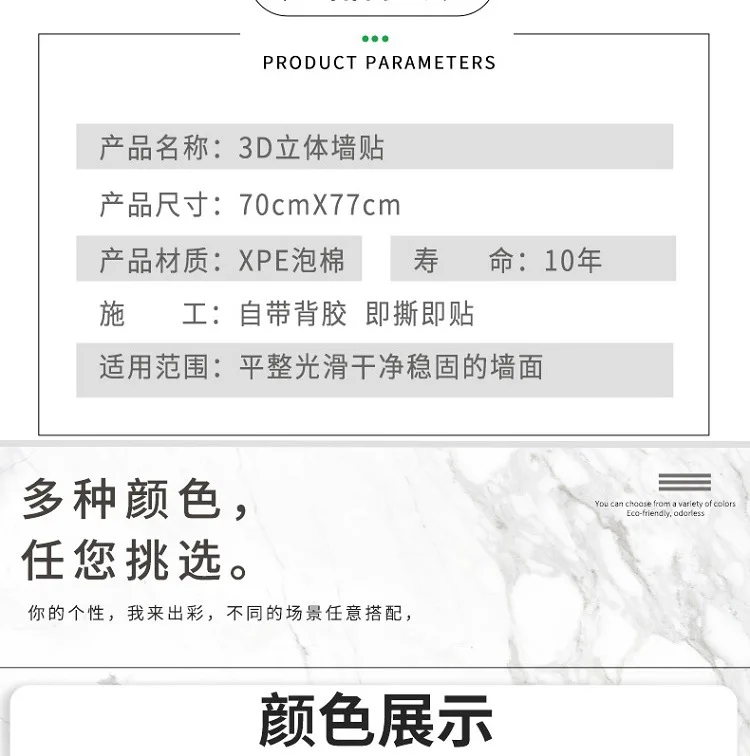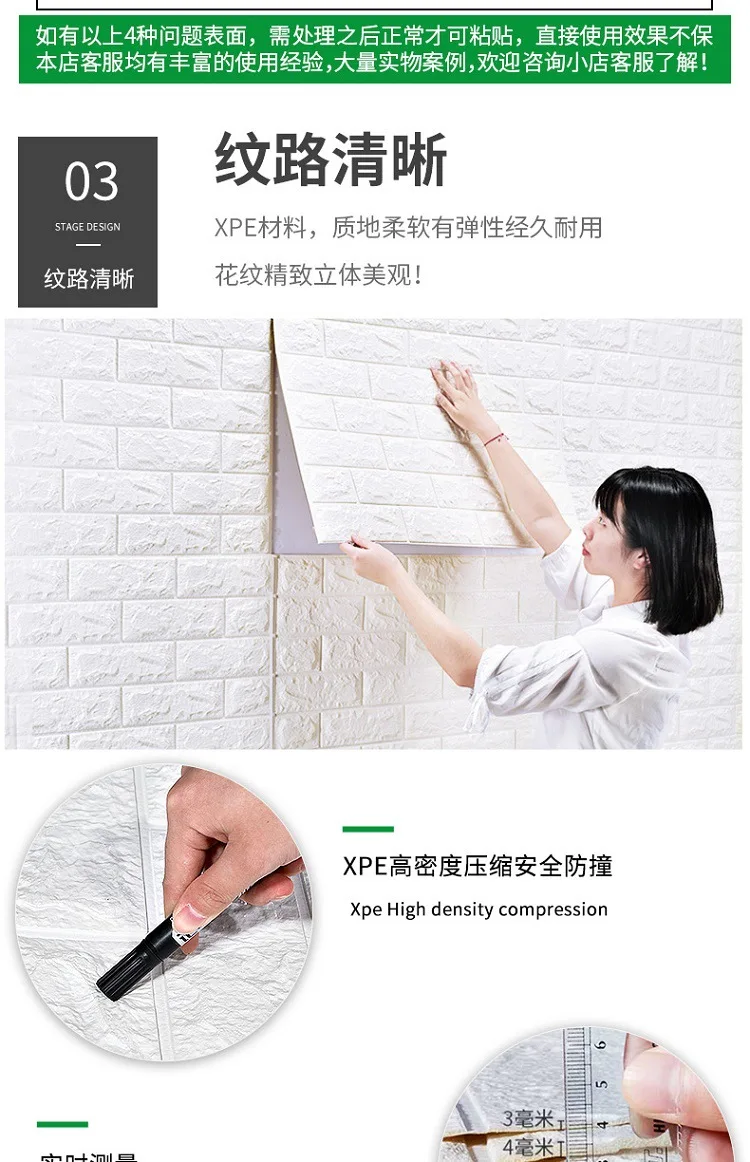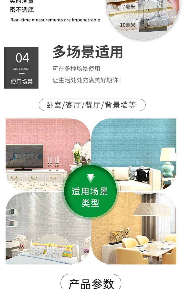 Характеристики: 1: трехмерная декоративная мягкая пена, защита от столкновений для детей, забота о вашей семье 2.: Безопасность и защита окружающей среды, нетоксичный запах, подходит для семейного безопасного домашнего пространства. 3: Реалистичный, естественный эффект кирпичного узора, простой и современный стиль. 4: Бесплатный DIY, простой самоклеющийся дизайн, установка, повседневный коллаж, произвольно резать. 5: Сравнение обоев с улучшенным эффектом шумоподавления. Методы установки и инструменты: Приклеивайте поверхность с адгезией, например: поверхность из дерева, поверхность из стекла, без пыли, нажмите на дно шпатлевки и так далее. Паста: на заднюю крышку разорвана бумага, приклеенная К вспомогательным инструментам: ножницы, нож: Пожалуйста, купите достаточное количество товара, чтобы убедиться, что товар поступает из одной партии, чтобы избежать разницы в цвете.