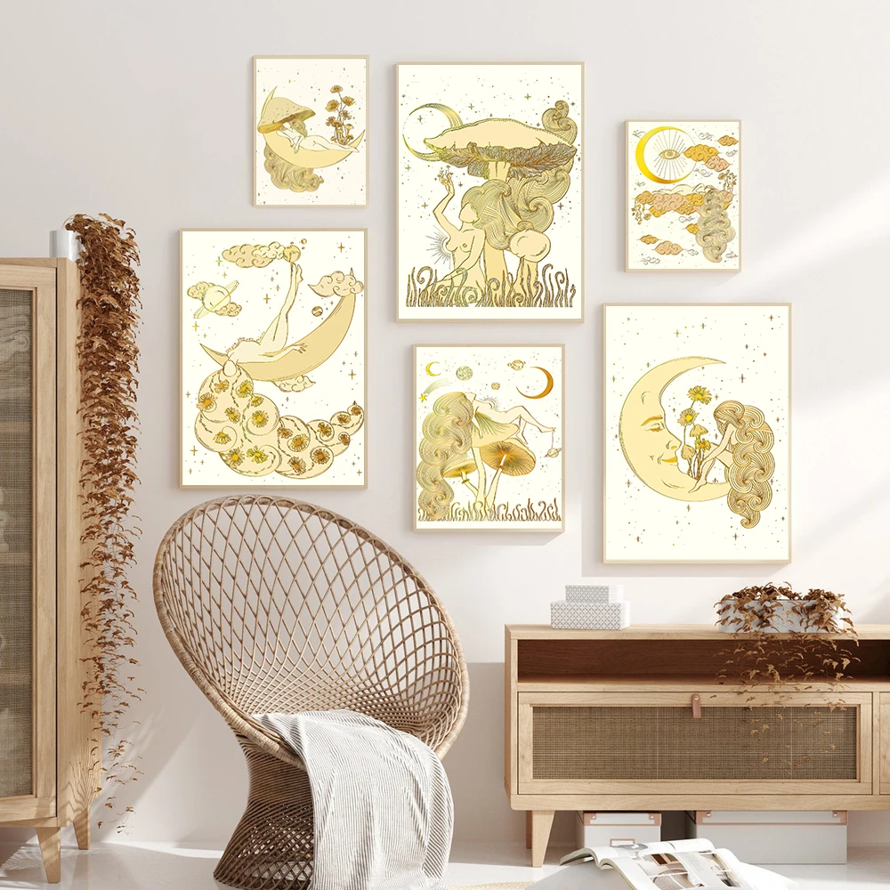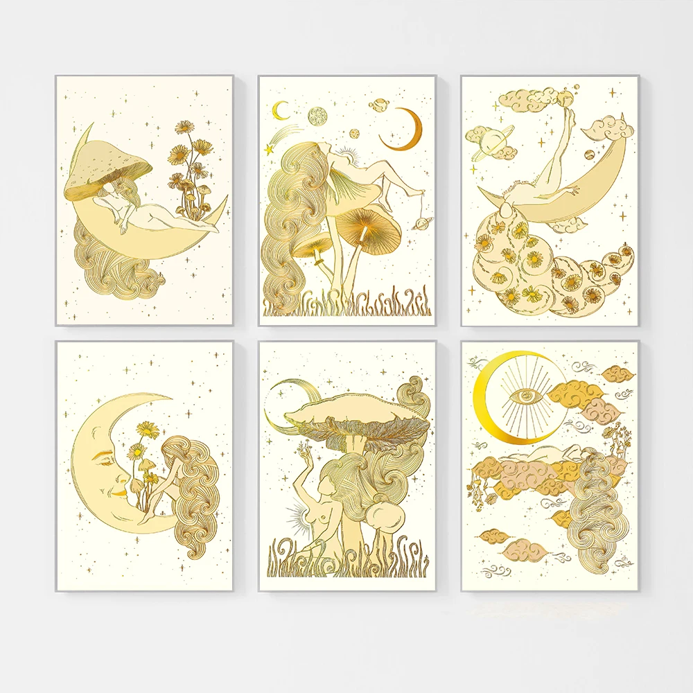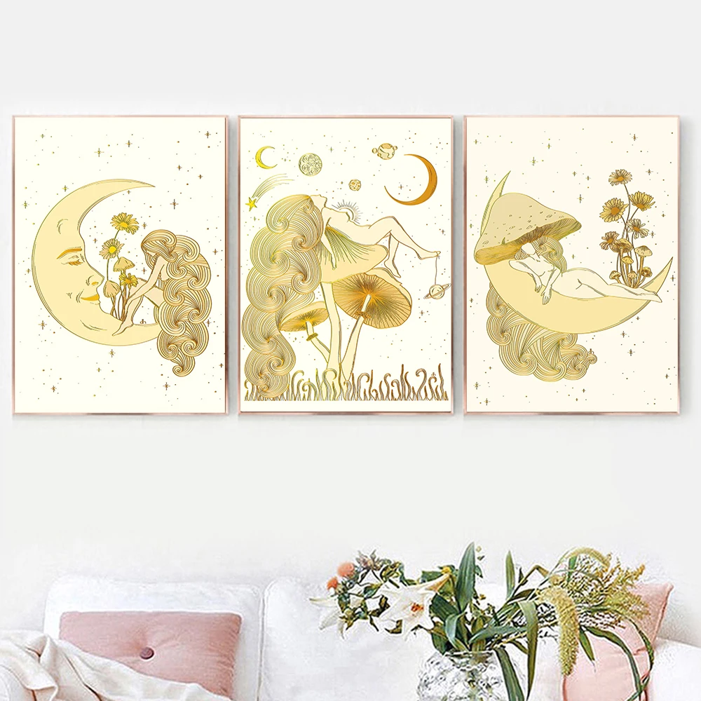 Психоделическая фотография в стиле бохо, золотая, небесная луна, женственная Картина на холсте, современные настенные картины, домашний декор для гостиной
