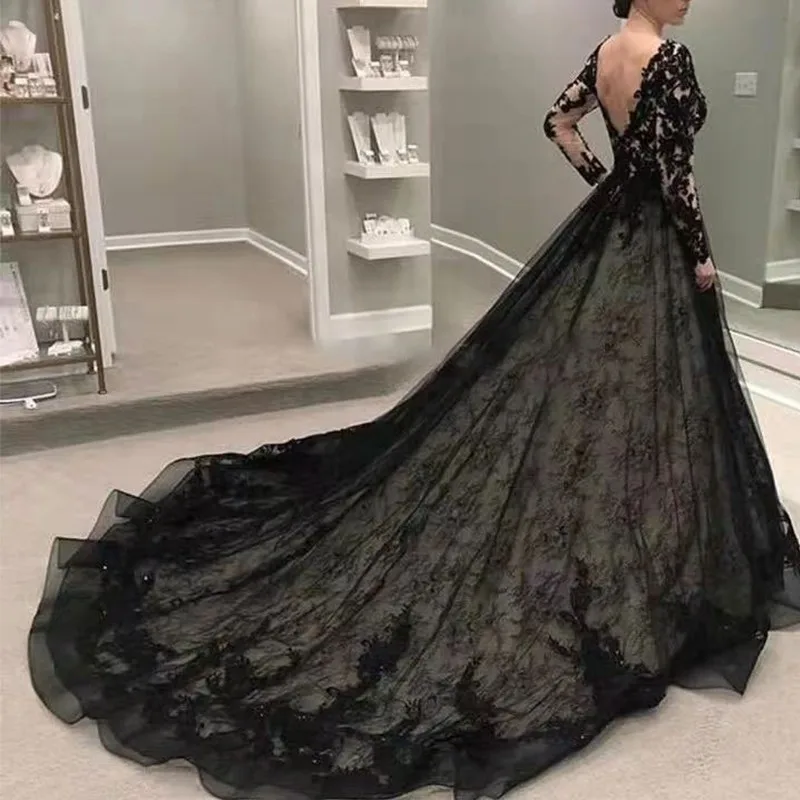 Винтажные Длинные свадебные платья черного цвета с длинным рукавом и открытой спиной и V-образным вырезом для невесты Vestido De Fiesta De Boda