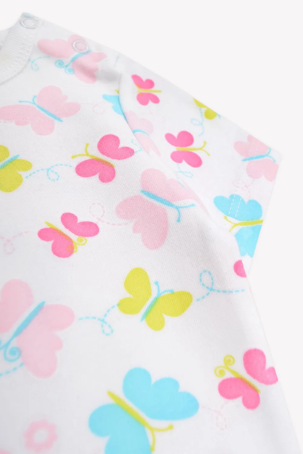Описание: Футболка для девочки из трикотажного хлопка с набивным рисунком. Короткие рукава. Застёжка на 2 кнопки в области плеча.