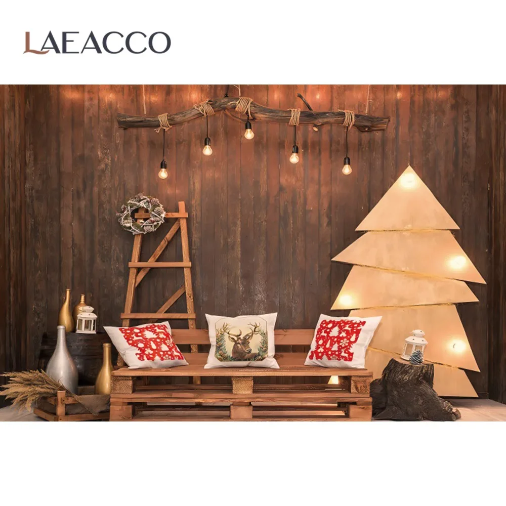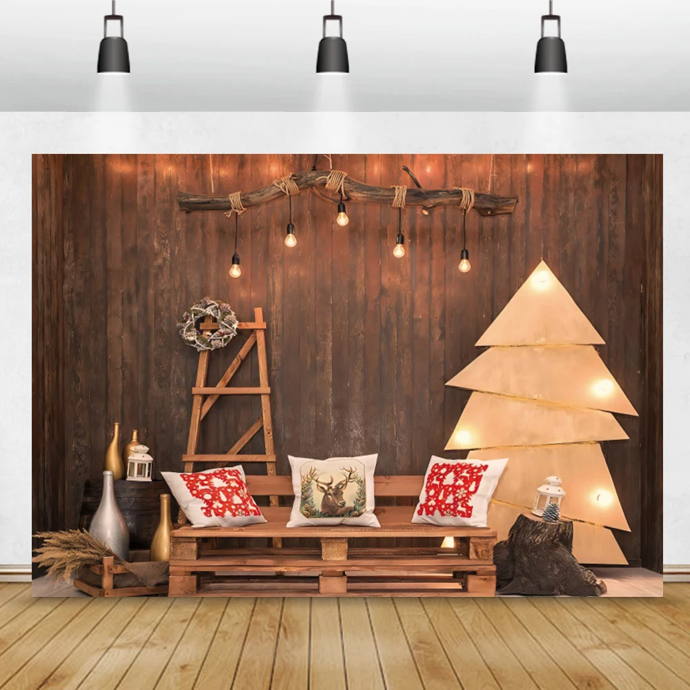 Фон для вечерние съемки с изображсветильник деревянной стула подушки рождественской елки лампочек деревянной стены складские конструкции для фермы