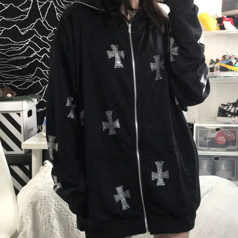 Y2K стразы женские толстовки со скелетом гранж Готическая толстовка черные хиппи на молнии толстовки большого размера Осень Зима Темный Waatfaak уличная одежда