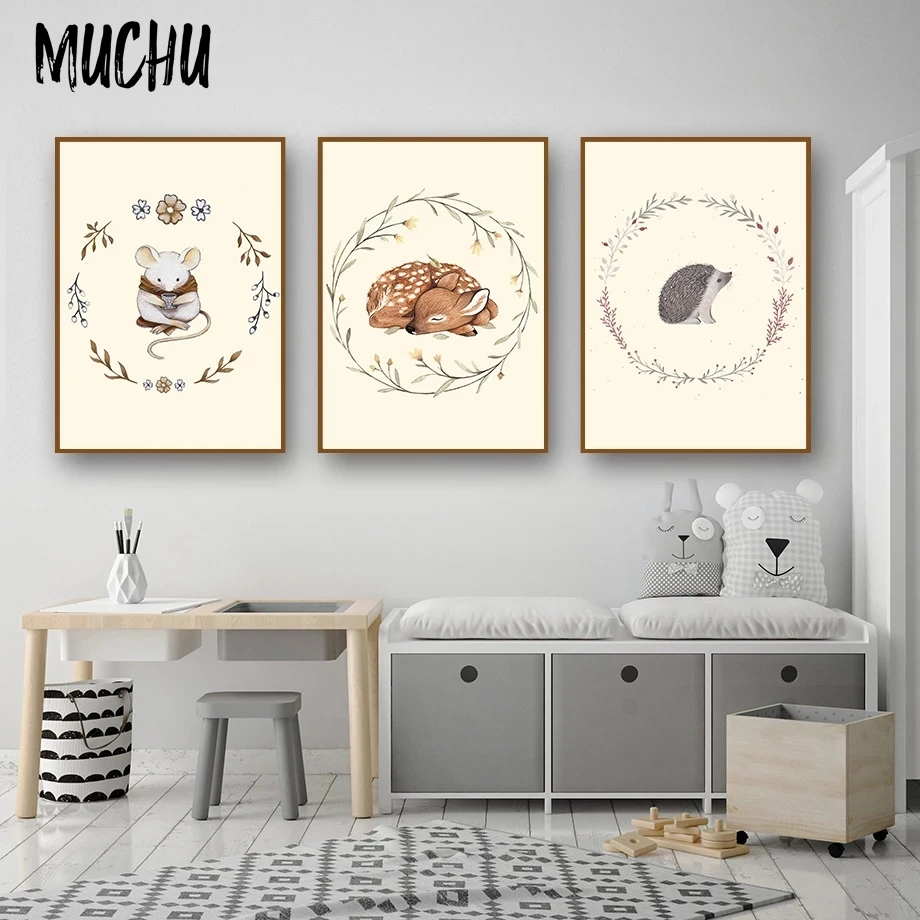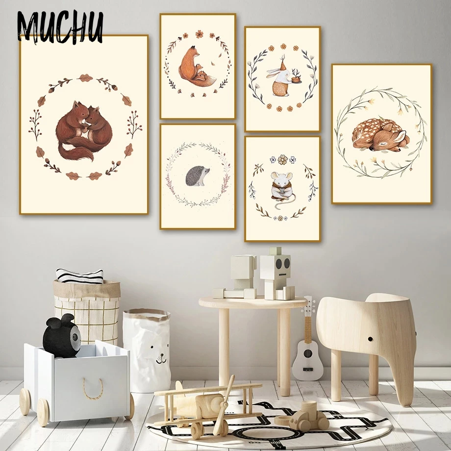 Олень, кролик, обнимающая лиса, белка, ежик, мышь, настенная Картина на холсте, Постер и принты на стену в скандинавском стиле, украшение для детской комнаты