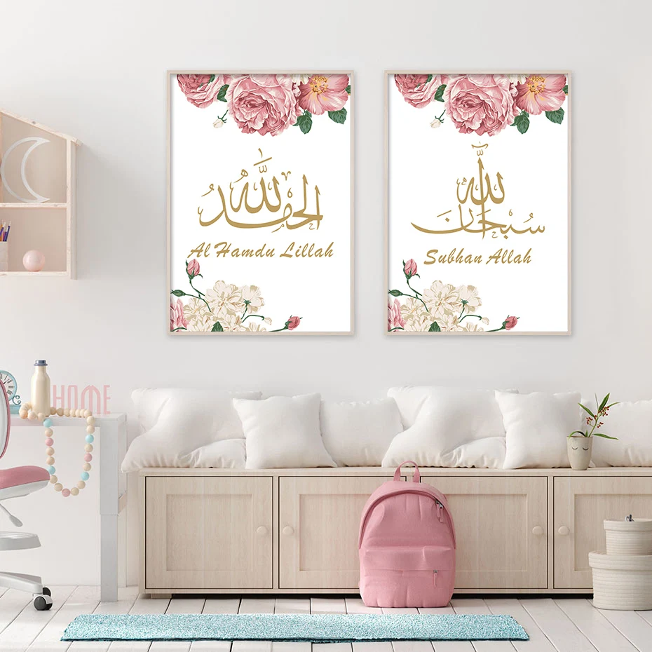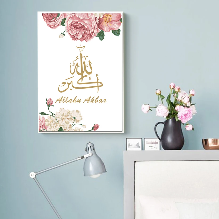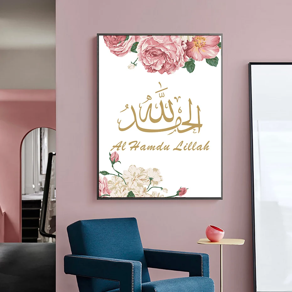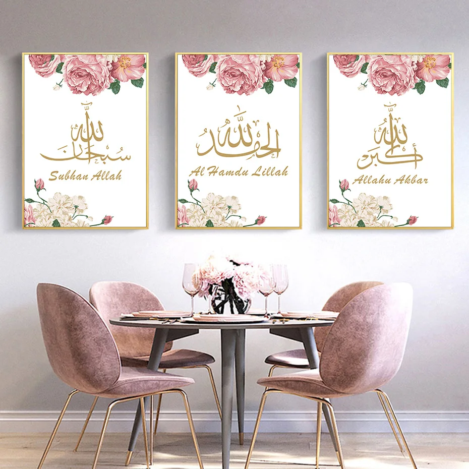 Розовая и Золотая мусульманская настенная живопись арабская каллиграфия принты абстрактный цветок холст картина Современная гостиная декор плакат