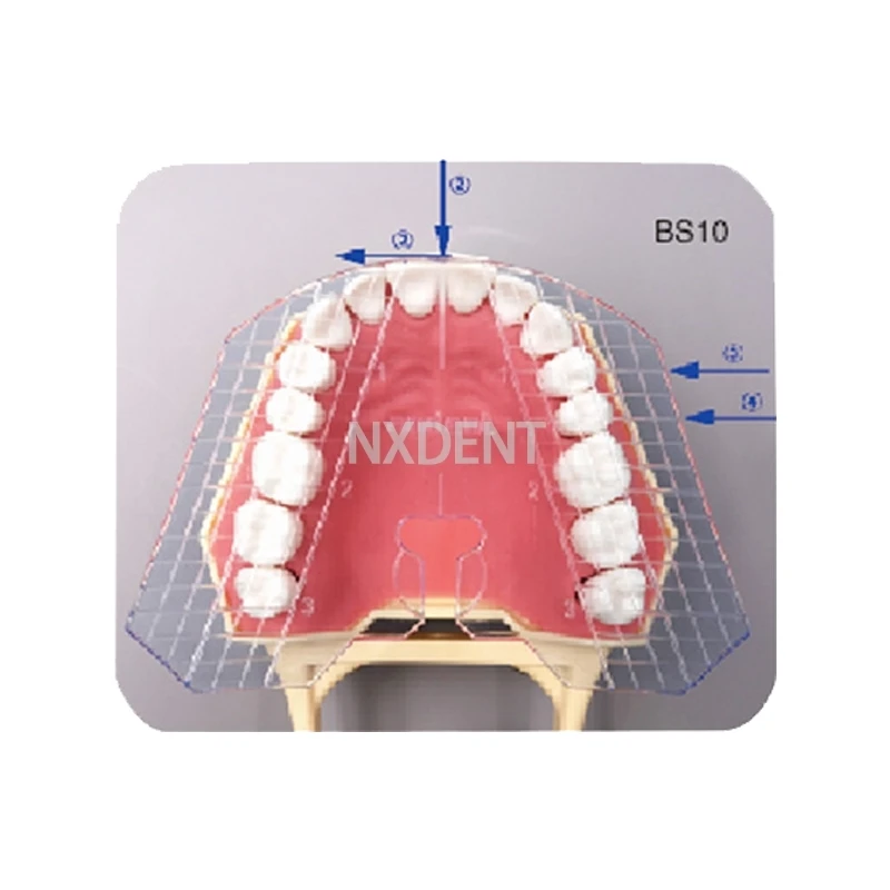 Инструкции:1. Поместите вогнутую направляющую пластину лицом вверх и поместите ее поверх полного протеза.2. Выровняйте центр направляющей зуба с зазором между двумя передними зубьями и убедитесь, что изогнутая линия над направляющей зуба выровнена с передними зубьями.3. Закрепите ряд направляющих пластин вручную в соответствии с указанным выше положением, а затем наблюдайте за резцами и зубцами с обеих сторон. См. Продольные и поперечные кривые в направляющей строки, чтобы наблюдать, являются ли резцы и зубцы с обеих сторон симметричными.4. Метод наблюдения: во-первых, определяется, находятся ли зубы с обеих сторон симметричного положения в большой симметричной большой области на направляющей пластине; Затем, обращаясь к маленькому квадрату на направляющей пластине, можно наблюдать хорошее положение.