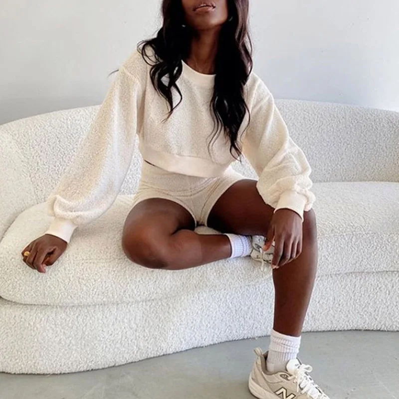 Женский кашемировый костюм с длинным рукавом, повседневный пушистый комплект из двух предметов, однотонный топ и мягкие шорты, домашняя одежда, осень-зима 2021