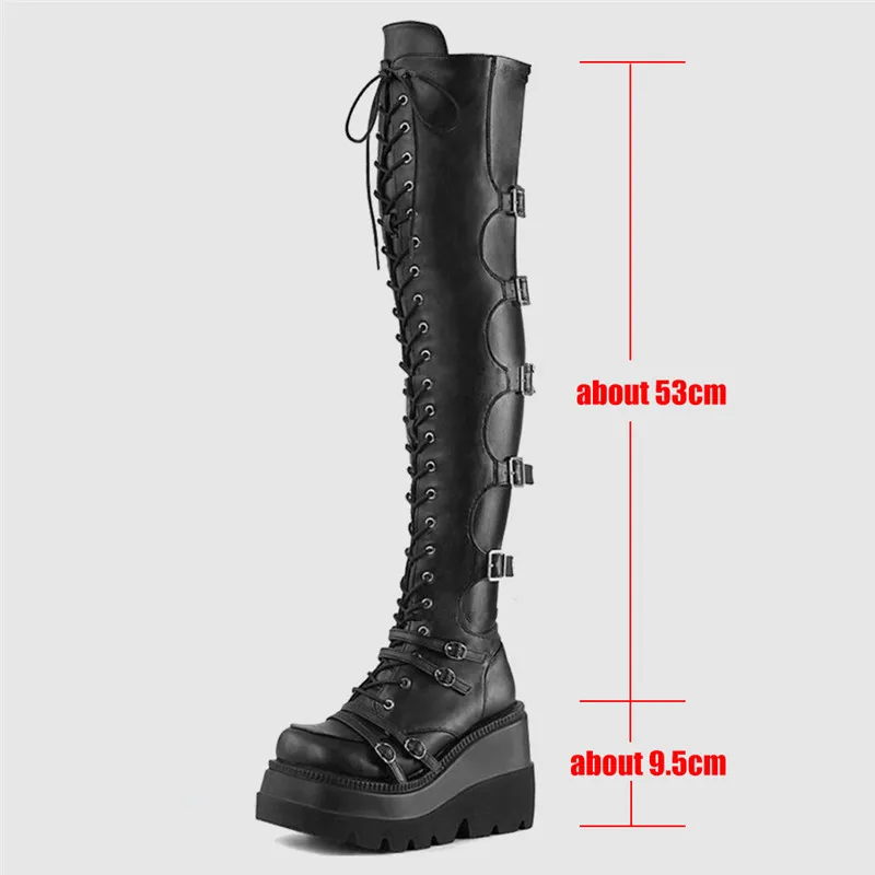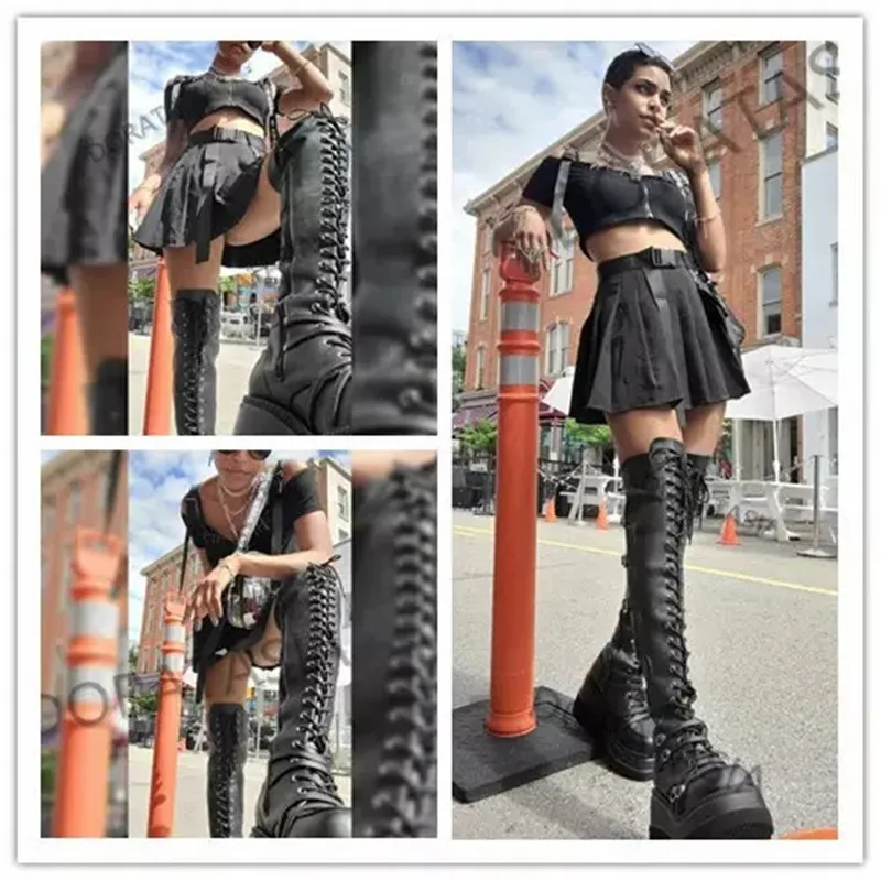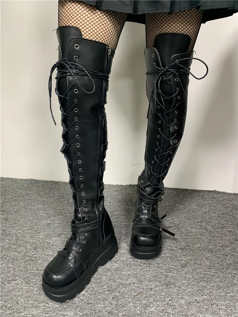 Женские ботфорты в стиле панк, сапоги на платформе, с круглым носком, на шнуровке, на танкетке, однотонные