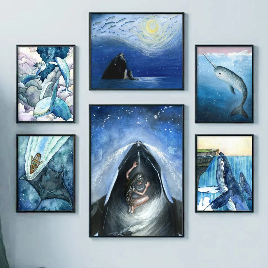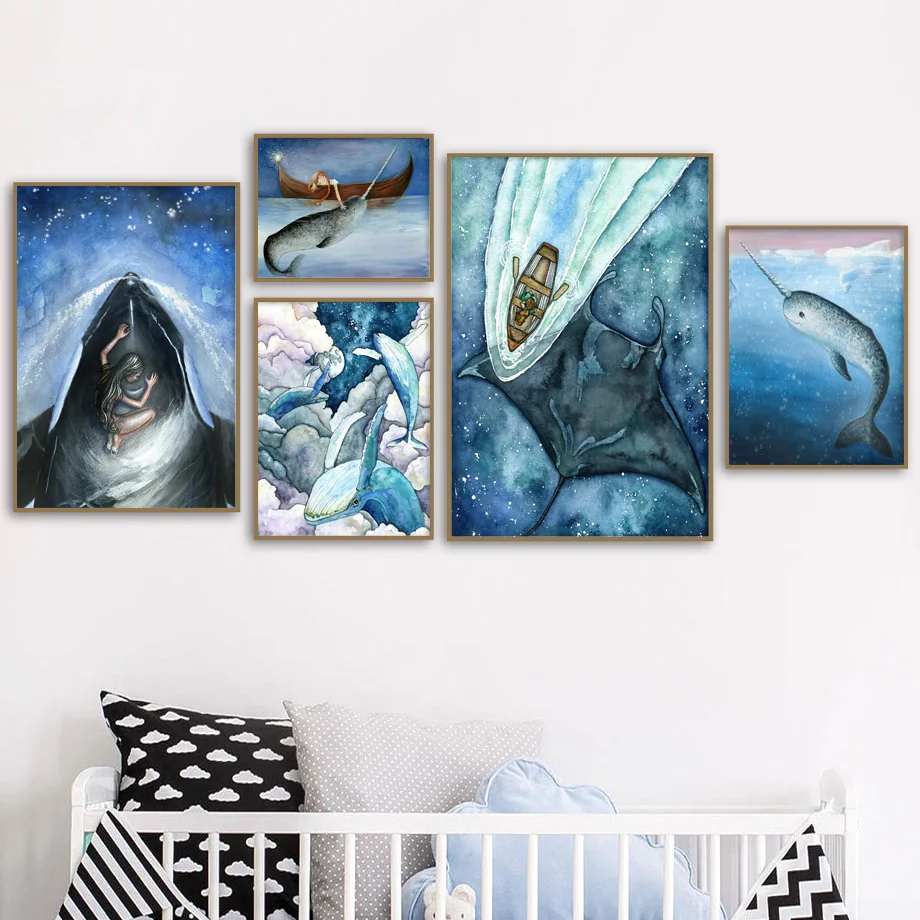Картина на холсте с абстрактным китам в скандинавском стиле для детской комнаты, настенные картины с изображением космоса, для девочек, художественные плакаты и принты