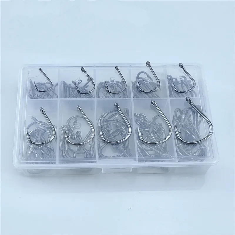 ①Включает в себя 100 штук рыболовных крючков для вас, выбирая различные размеры от 3 # до 12 #.