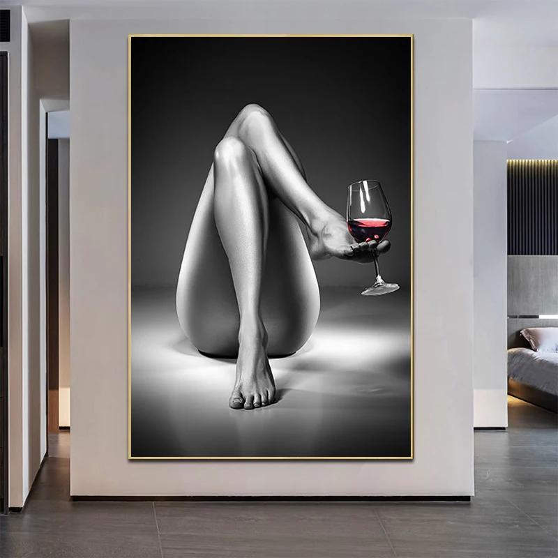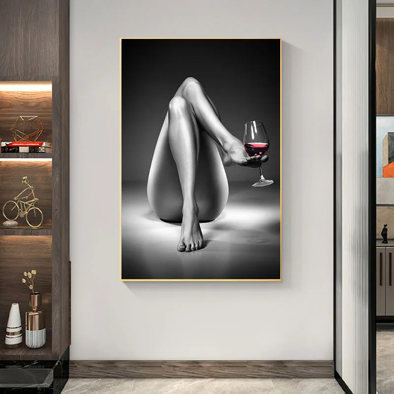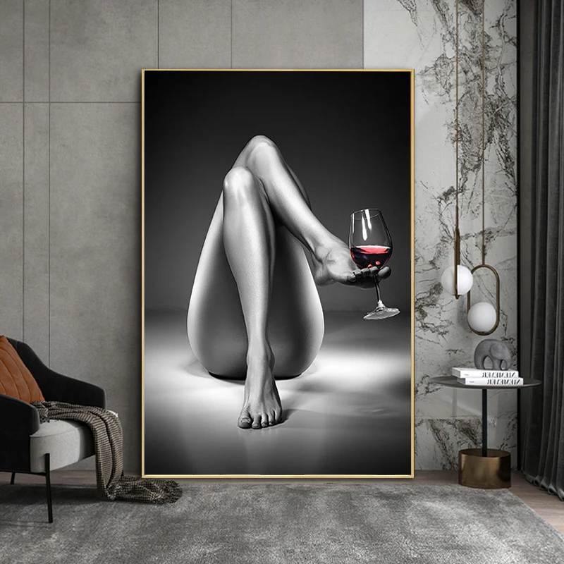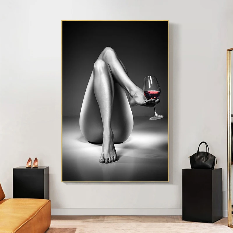 Постер на холсте с изображением бокалов с обнаженными ногами и красным вином, черно-белый, с сексуальным телом, современные настенные картины для украшения гостиной, дома