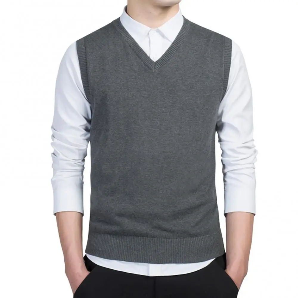Мужской осенне-зимний однотонный вязаный свитер без рукавов с V-образным вырезом деловой жилет