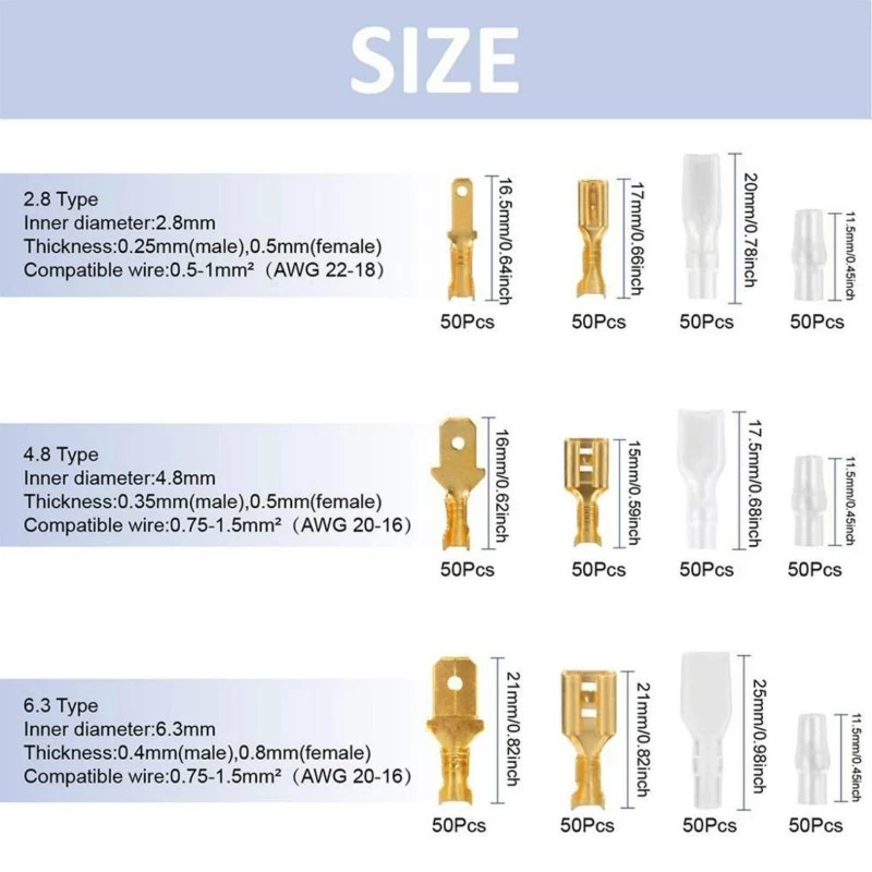 6,3 мм: 0,75-1,5 мм²/AWG 20-16;50 stück männnich und 50 stück weiblichJeweils 50 stück Schutzhülle für männnich und weiblich4,8 мм: 0,75-1,5 мм²/AWG 20-16 лет;50 stück männnich und 50 stück weiblichJeweils 50 stück Schutzhülle für männnich und weiblich2,8 мм: 0,5-1,0 мм²/AWG 22-18;50 stück männnich und 50 stück weiblichJeweils 50 stück Schutzhülle für männnich und weiblich