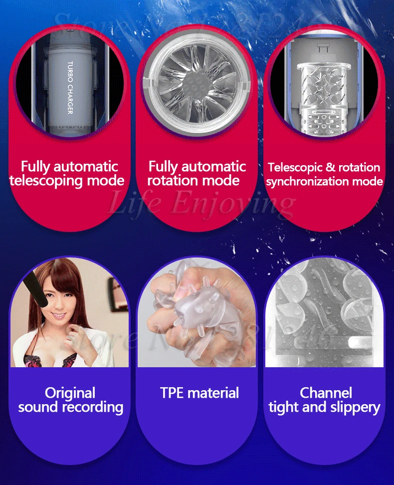 1. Полностью автоматический телескопический, вращающийся режим, 10 сексуальных режимов звука, мягкий материал ТПЭ, мощный двойной мотор; 2. Полностью автоматический телескопическая ротация 460 раз в минуту, телескопический поворотный синхронный режим, при расположении стороны, 3. Индивидуальный автоматический телескопический режим 280 раз/минуту, отдельный автоматический режим вращения 330 раз/минуту, 10 наборов частоты телескопическая ротация; 4. Положительный и отрицательный 2 вида поворотного режима, 3 + 7 видов вращения, формирование более 10 видов режимов стимуляции; 5. Двухмоторное многослойное управление, телескопический ход 45 мм, виртуальный кожный канал 4D, десятки грануляционных мягких и прозрачных эластичных ТПЭ; 6. Функция одной кнопки, прозрачное окно на 360 °, Функция паузы одной кнопкой, подключаемые наушники для защиты конфиденциальности, зарядка через USB