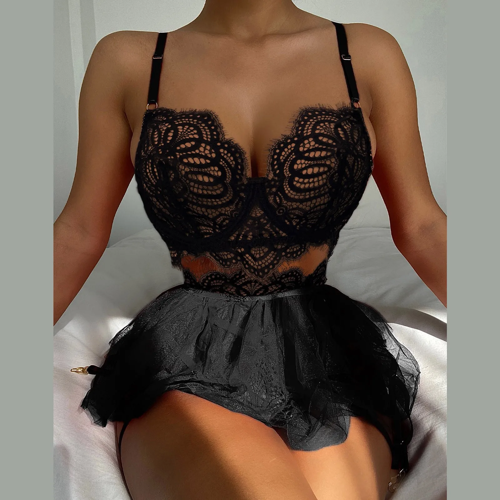 Женское сексуальное нижнее белье, кружевные стринги, нижнее белье, ночное белье, мини-юбка, бюстгальтер, стринги, костюм из трех предметов