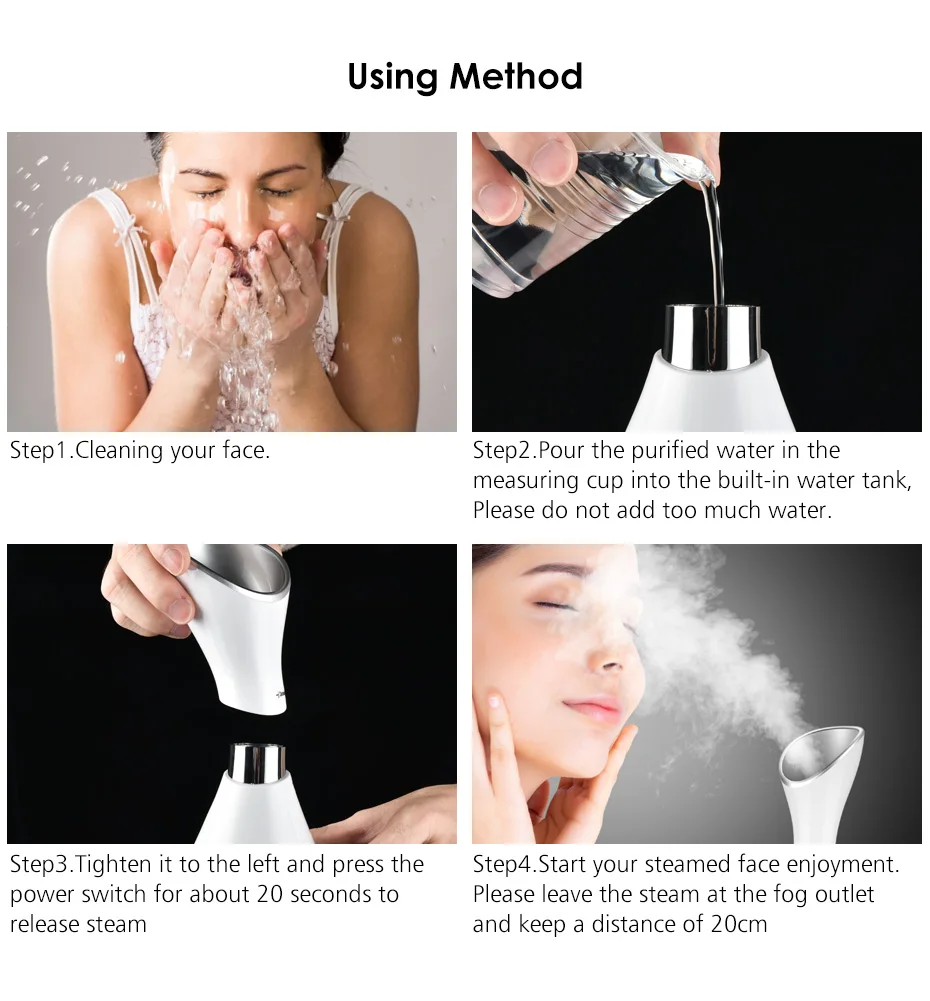 4. Подключаемый дизайн с гибким шнуром питания, подходит для беззаботного домашнего ухода за кожей, поставляется с большим мерным стаканом, только один стакан воды можно пропарить в течение 8-10 минут, практично и легко добавить воду.