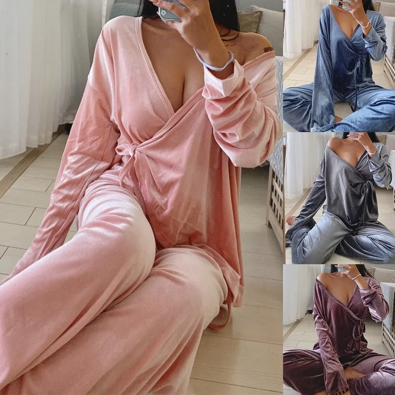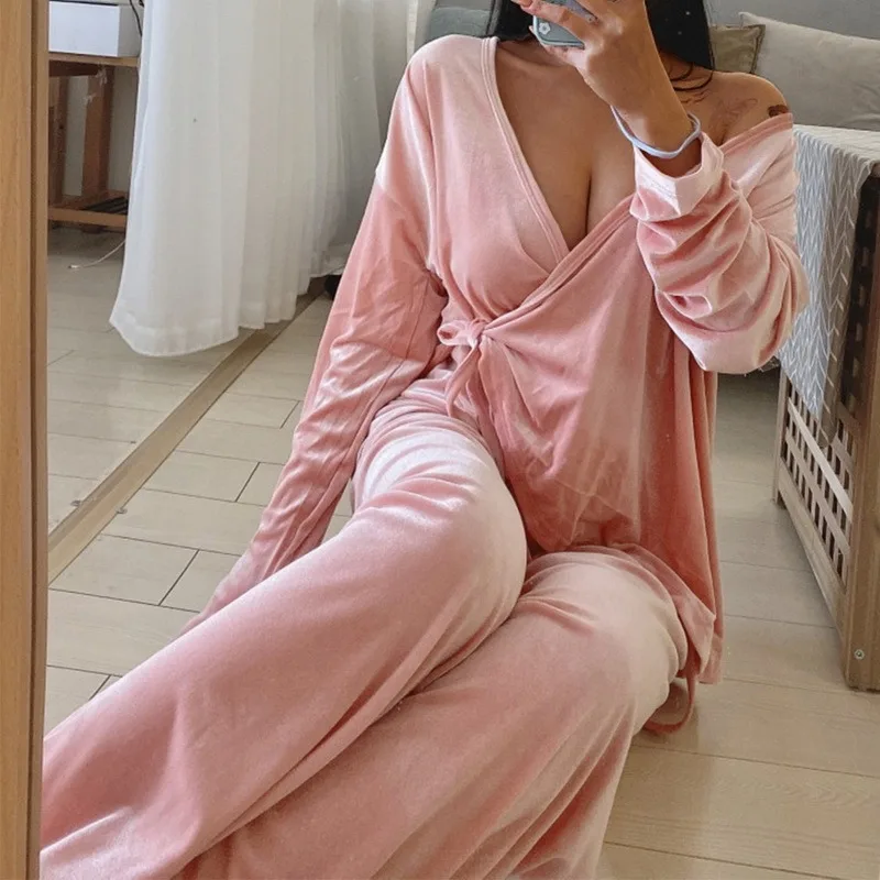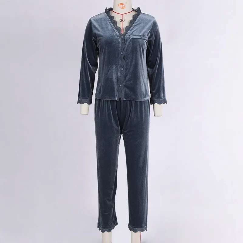 Бархатная Пижама, Женская осенне-зимняя одежда для сна с длинным рукавом, повседневная одежда для сна, Пижамный костюм, Свободная Домашняя одежда, кружевной комплект для сна