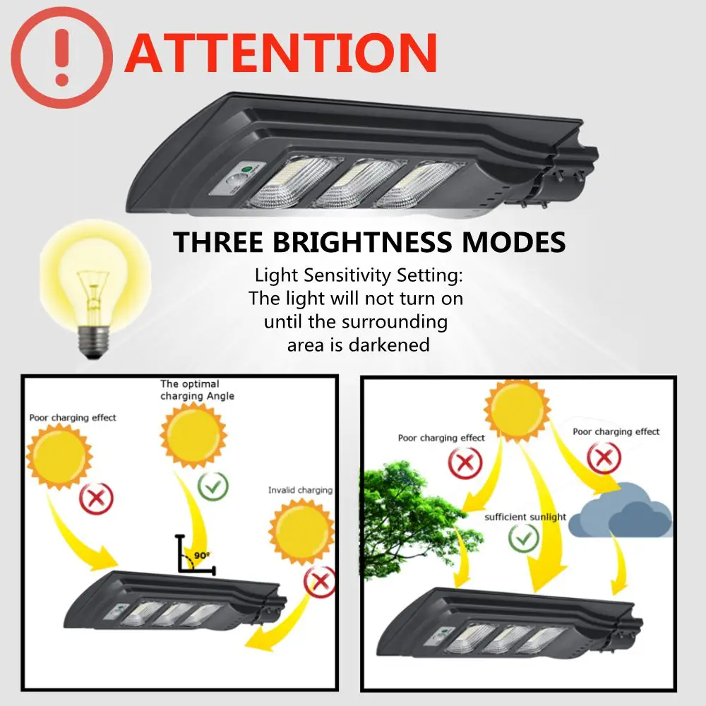 【Режим супер чувствитель】Автоматически начинается в сумерках, автоматически выключается на восходе и автоматически заряжается. Яркость увеличивается по мере приближения людей, и яркость уменьшается автоматически, когда люди уходят. Его можно непрерывно загорать более 48 часов после полной зарядки в течение дня. Дальность срабатывания составляет 6-8 метров, а Площадь облучения может достигать 70-80 квадратных метров.