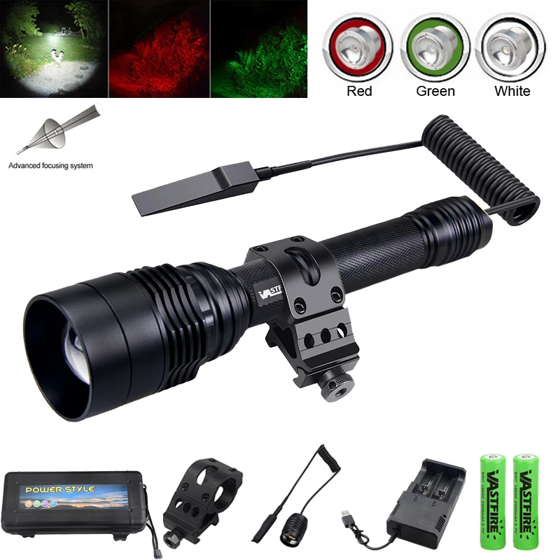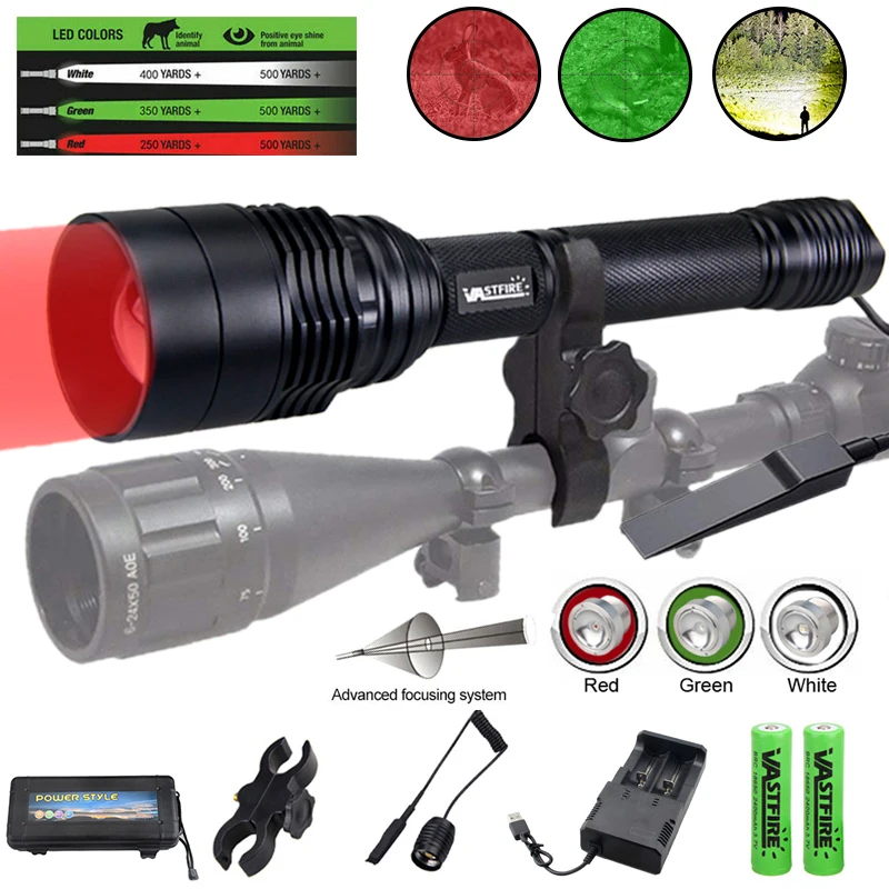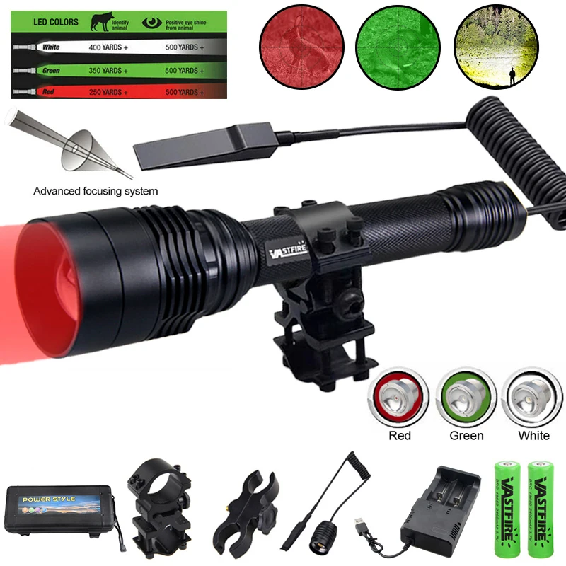 1x Зеленый светодиодный фонарик1 красная светодиодная лампа1 белая светодиодная лампа1 х дистанционный переключатель давления1 x крепление для фонарика1 x Крепление2x3,7 V 18650 Перезаряжаемые батареяЗарядное устройство-1 шт.