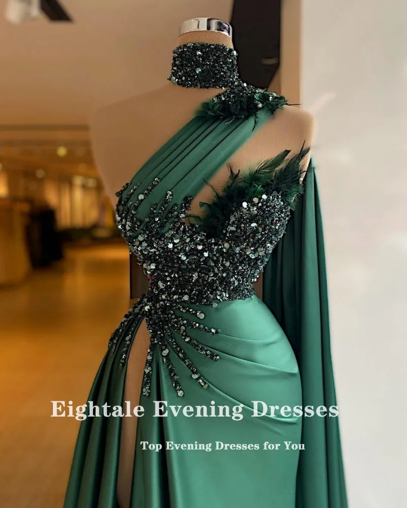 Изумрудно-зеленые вечерние платья с перьями, с высоким воротником и бусинами, с разрезом сбоку, длинное праздничное платье